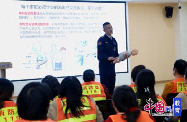 活动分为三个部分。首先,由六进消防中心熊教官带领家长集中学习消防安全理论知识,掌握海姆立克急救法的操作要点;随后,泸州市滨江幼儿园班级教师带领幼儿进行火灾逃生演练,提高火灾逃生技能;最后,熊教官组织家长及幼儿开展室外亲子消防互动,模拟火情时的自救过程,强化家长的火场自救技能。