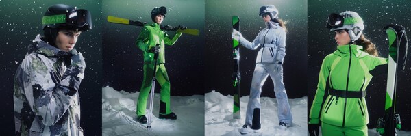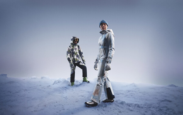 此次联名呈现的双板滑雪服系列,诠释了迪桑特在专业机能与艺术表达之间的精准融合。采用DERMIZAX防水、防风、透湿且具弹性的面料,在确保防护性能的同时兼顾滑雪动作的灵活延展,并配合HEATNAVI吸光发热里衬,在严寒环境中实现保暖与透湿的平衡。男款滑雪服内里填充PRIMALOFTBLACK科技棉,结合BREATHINGSYSTEM[1],兼具保暖性和透气性;女款滑雪服则采用PRIMALOFTSILVER,兼顾轻盈与保暖。剪裁方面男款以一片式肩部剪裁结构减少滑行过程中的束缚感,并配备可兼容雪盔的大尺寸防风帽,强化实用体验;女款则以针对亚洲女性优化的修身廓形打造,修饰身形并拉长腿部比例,设计语言取自雪道上的雪痕,将迪桑特品牌标识箭头元素融入分割线与细节表达,强化视觉识别。雪裤部分延续相同的科技结构,在脚口内侧加入耐磨拼接以提升耐用度与防护性。由DanielArsham定制的图案贯穿整体设计,使专业性能与艺术语言在统一视觉中达成平衡,展现独特的辨识度。