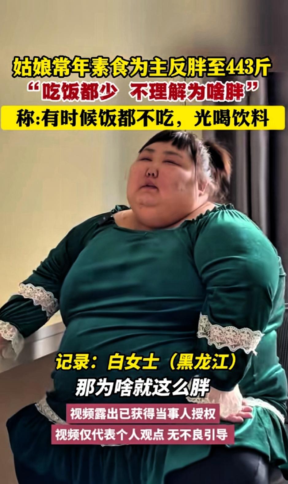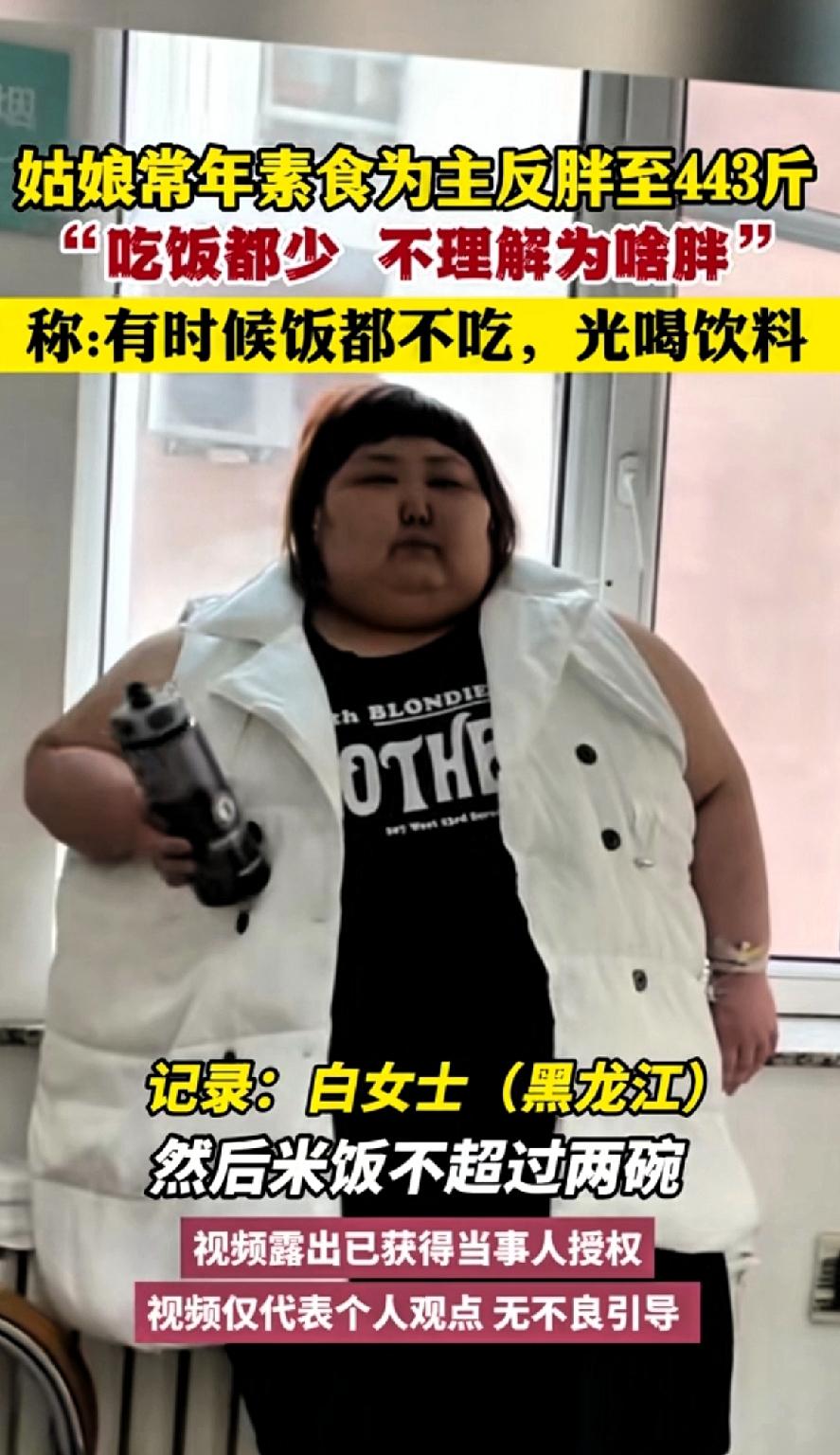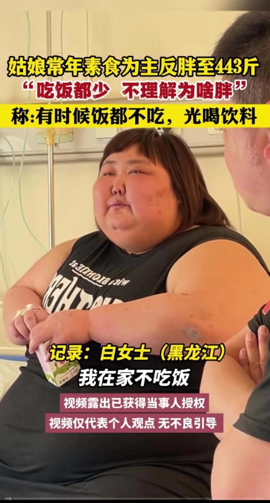 姑娘常年素食为主反胖至443斤,据姑娘所说自己吃饭都少,不理解为啥会胖? 称有时候饭都不吃 光喝饮料还是会胖!听这姑娘说话都觉得可笑! 先说自己吃饭很少一顿也就两个馒头 米饭不超两碗,这些都是碳水,而且俩馒头也不少! 再说饮料含糖量都是非常高,喝饮料还不如正常吃饭呐! 自己很少吃肉,即使吃肉也是瘦肉! 如果姑娘身体没毛病,胖成这样肯定是饮食不当缺乏运动引起的! 如她所说的很少吃肉,其实吃素还胖,原因不少。一些素菜并非低脂,像“蒜香茄子”“干煸豆角”,茄子这类疏松多孔食材堪称“吸油王者”,能吸入大量油脂。 还有高淀粉蔬菜,烹饪时也会加入不少油。而且,吃素若吃大量高热量素食,或营养不均衡影响代谢,再加上缺乏运动,能量消耗少,体重自然容易上升。 所以吃素也得讲究方法,合理搭配并适当运动很重要。 我对于胖人所说的我吃饭很少,饭量很小以前听到这样的话会相信! 自从跟远方表姐生活一个星期之后,我再也不相信胖人口中的不吃饭减肥这句话了,为什么会这样呐? 还是讲下我表姐的饮食吧!表姐个头不高,身体肥胖,当然没有400多斤!但肥胖的身体也像气充的一样! 这样形容很贴切,却不好听,但是事实。 表姐1米5多体重快200斤!天天嚷着减肥,一到吃饭经常就是我不吃了。 可是碰到合口的饭食用盆盛来吃! 爱吃辣的口味也重,胃口非常好,喜欢油炸食物! 生活在一起几天我就知道胖子所谓的饭量小,什么我吃很少是什么意思了,她们嘴上念着减肥这顿不吃,结果下一顿顶我一天的量。 暴饮暴食,每个健康的胖子绝对有超级好的胃口,和暴饮暴食的习惯。 如果吃的少,那身上的肉从哪来的?还是从嘴里吃出来的呗。