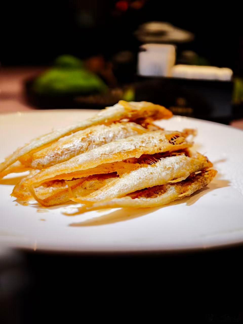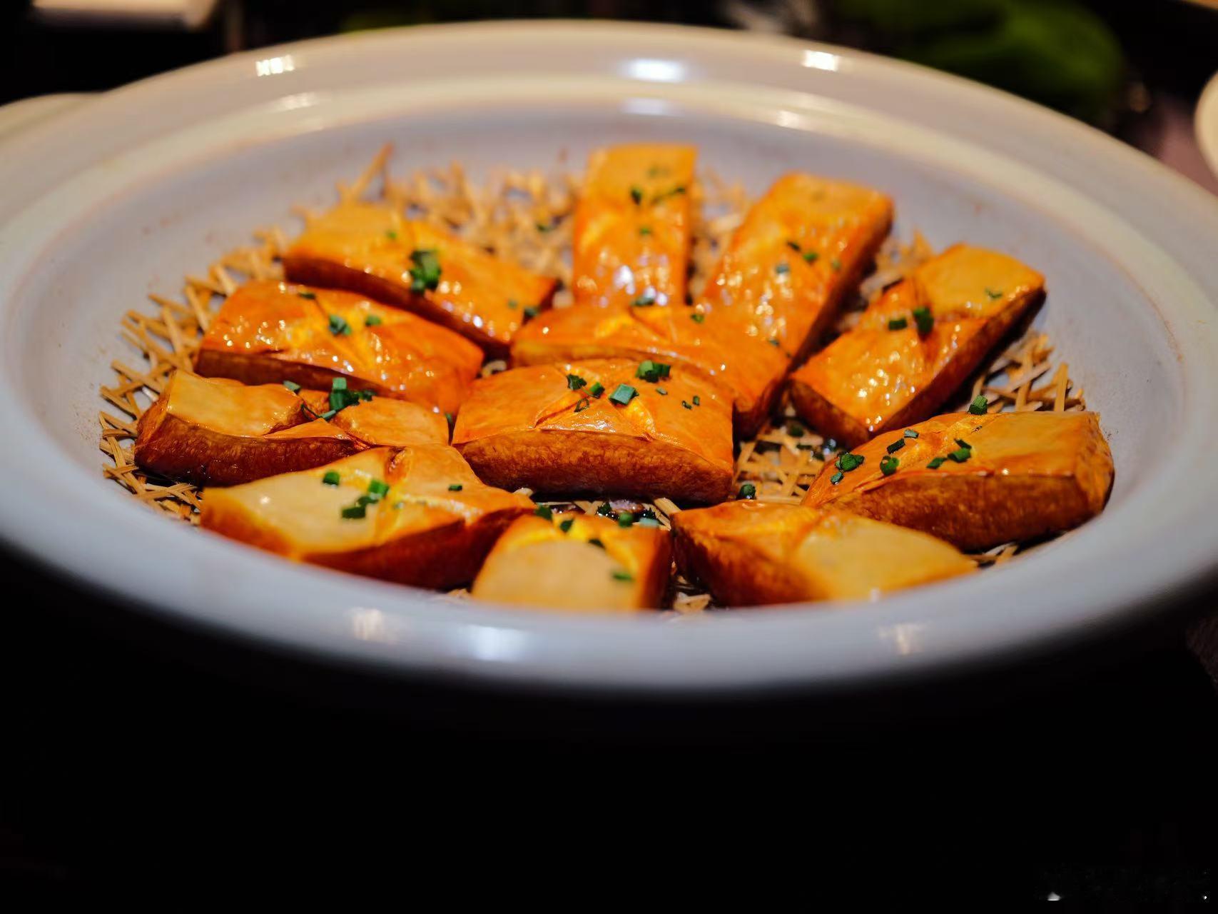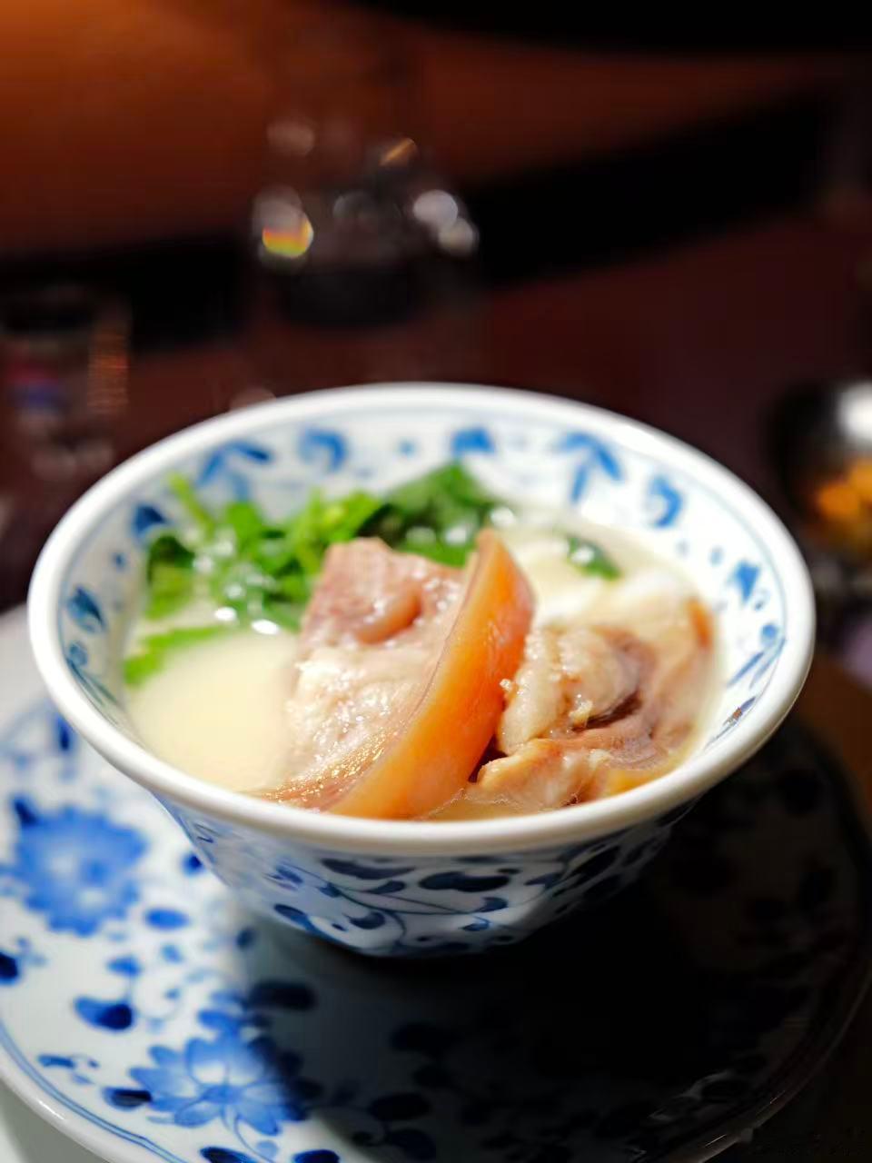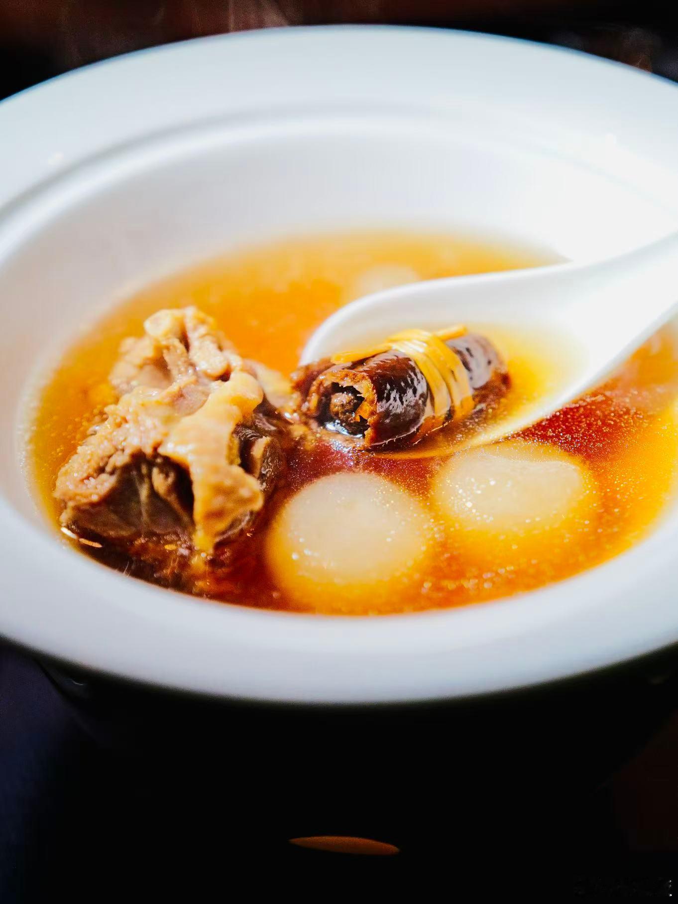 江苏的海刀鱼用潮汕香酥的方式呈现,大闸蟹做成潮汕的美味“毒药”生腌;闽南山区的山苏叶拌河源车田村的鲜腐竹,食材的优选精确到一个村,真的厉害;陈皮水鸭、柚皮焖龙趸、花甲王乐昌炮弹芋头,蟹粉沙地萝卜,新会、梅州、韶关地理标志物产齐聚;又搜罗了遵义的土猪,宁夏滩羊煲汤;甚至能吃到浓郁甜糯的蜜烤长白山林下参,蜂蜜都是当地野生的。