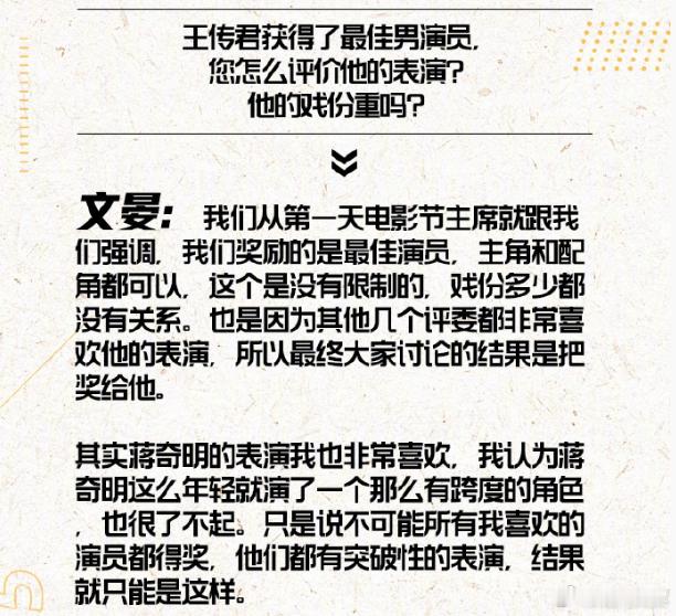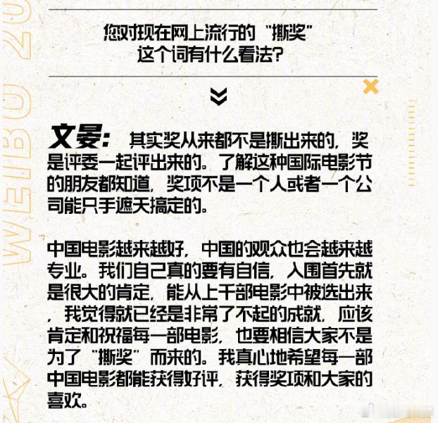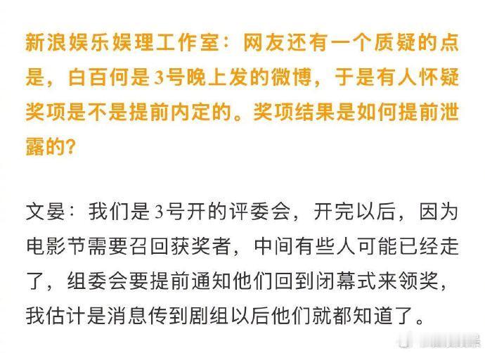 文晏导演在回应里表示她不认识白百何,也不知道什么叫“沪圈”,但认为白百何很优秀,只是这次的女主竞争实在太激烈,王传君获奖是评委讨论的结果,跟戏份多少没有关系,自己也非常喜欢蒋奇明的表演。她还对“撕奖”一词做出了回应:“其实奖从来都不是撕出来的,奖都是评委一起评出来的。了解这种国际电影节的朋友都知道,奖项不是一个人或者一个公司能只手遮天的。”via