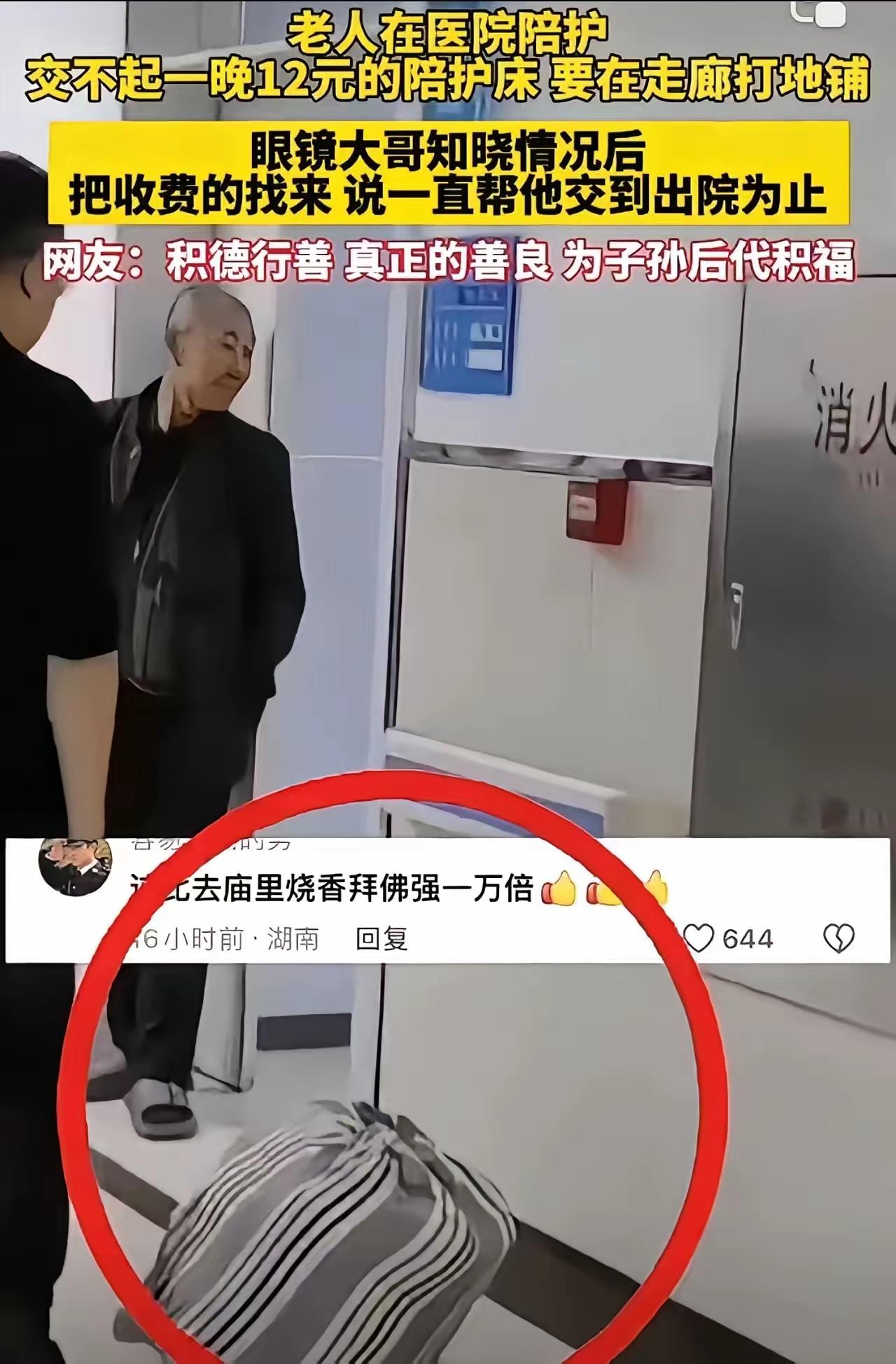 老人在医院陪护,交不起一晚12元的陪护床,打算在走廊打地铺。一位戴眼镜的大哥看到后,一番举动让老人泪目!网友:这才是真正的善良,比去庙里烧香拜佛强一万倍! 在这个快节奏、功利至上的社会里,我们常常忽略了那些最需要帮助的人。而就在不久前的某家医院里,一幕温暖人心的场景再次点燃了我们内心的善意。老人因为经济困难,无法承担每天12元的陪护床费,只得决定在走廊里打地铺,期待着能陪伴在亲人的身边。或许,这样的场景在某些人眼中只是一份微不足道的困境,但在善良人心的滋养下,却成为了一股温暖的力量。 就在老人犹豫徘徊之际,一位戴着眼镜、满脸慈祥的大哥走了过来。他没有犹豫,没有多问,直接拿出自己的被子和枕头,坚定地站在老人身旁,告诉他:“不用担心,我陪你一起。”简单的话语,却像春风一样拂过老人满是皱纹的脸庞。老人眼眶湿润,哽咽着说:“谢谢你,这世上还是有好人啊。”那一刻,所有的冷漠仿佛都被融化,只剩下一份纯粹的温暖。 这位大哥的举动,或许微不足道,但却折射出最真实的人性光辉。在这个充满浮躁、利益的社会中,善良的行为像一滴清泉,滋养着每一个被冷漠侵蚀的心。有人说,善良是一种无声的力量,它不需要炫耀,也不求回报,却能在不经意间温暖整个世界。正如这位大哥,他没有高调的宣传,没有动辄的豪言壮语,他用行动告诉我们:善良可以很简单,也可以很伟大。 网友们纷纷点赞,评论区一片感动。有的人说:“比起那些迷信庙里的香火,真正的善良才是最有力量的信仰。”有人感慨:“这个社会需要这样的好人多一些,让我们的生活更有温度。”还有人留言:“希望每个需要帮助的人都能遇到像他一样的善良天使。”这不禁让人深思:我们是不是也应该用行动去温暖那些在暗处挣扎的人?是不是每个人都可以成为别人的“那一位大哥”? 善良,从不需要多么宏伟的词藻,它只是一份发自内心的关怀与行动。当我们在日常生活中遇到需要帮助的人,不妨放慢脚步,伸出援手。也许你的一个微笑、一句问候、一份帮助,就能成为别人的希望和力量。这世界需要更多这样的善良大哥,也需要我们每一个人的善意和行动。 让我们记住:真正的善良,不在于华丽的辞藻,而在于点滴的行动中。因为,善良本身,就是最美的力量。善良