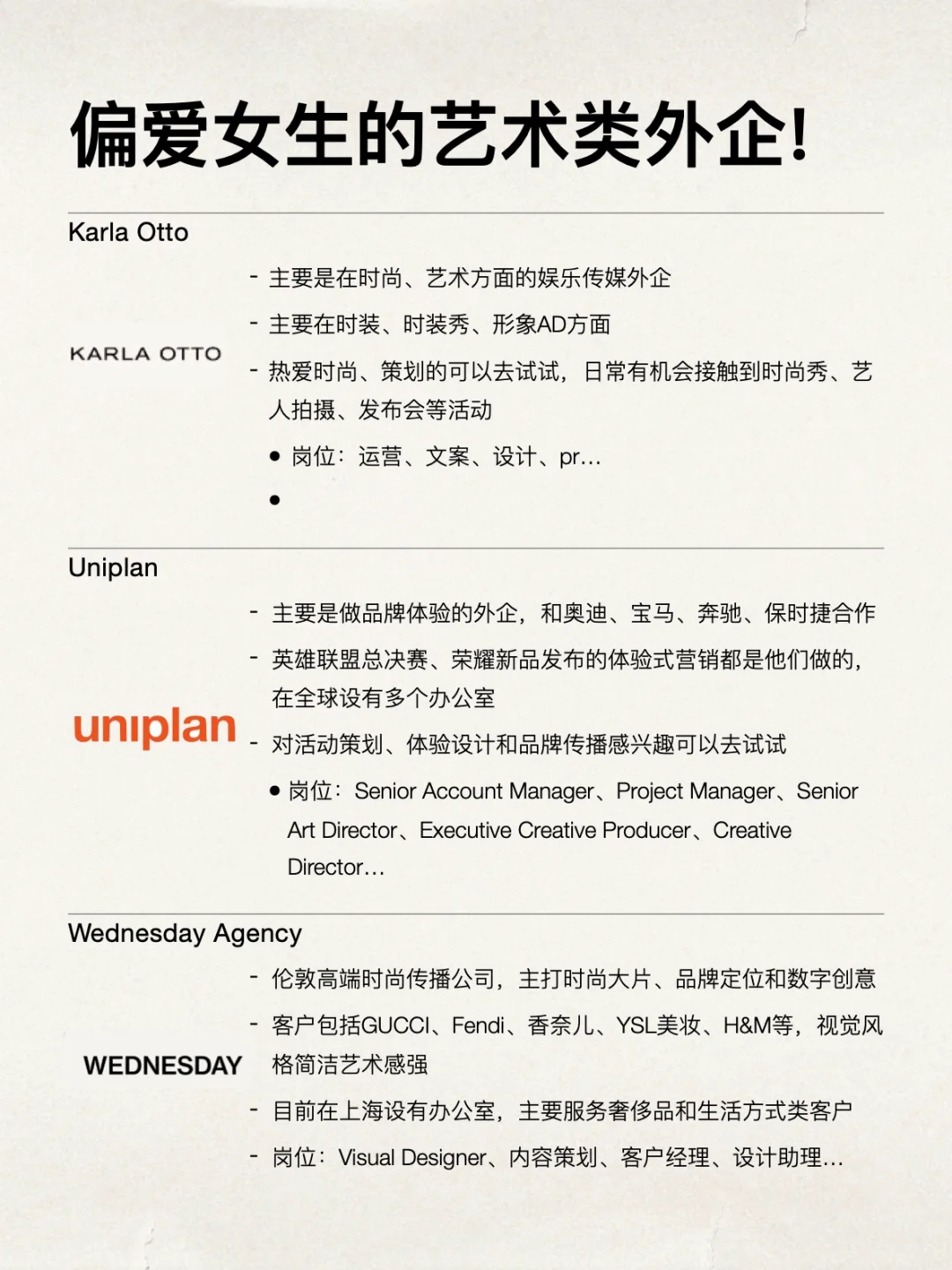 为什么建议大家去投?因为艺术类外企普遍福利好、加班少、注重个人成长,氛围轻松但标准不低,很适合想兼顾创作感和生活平衡的女生。