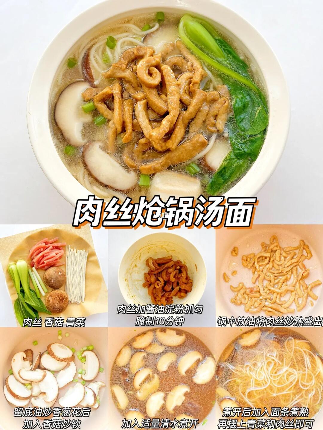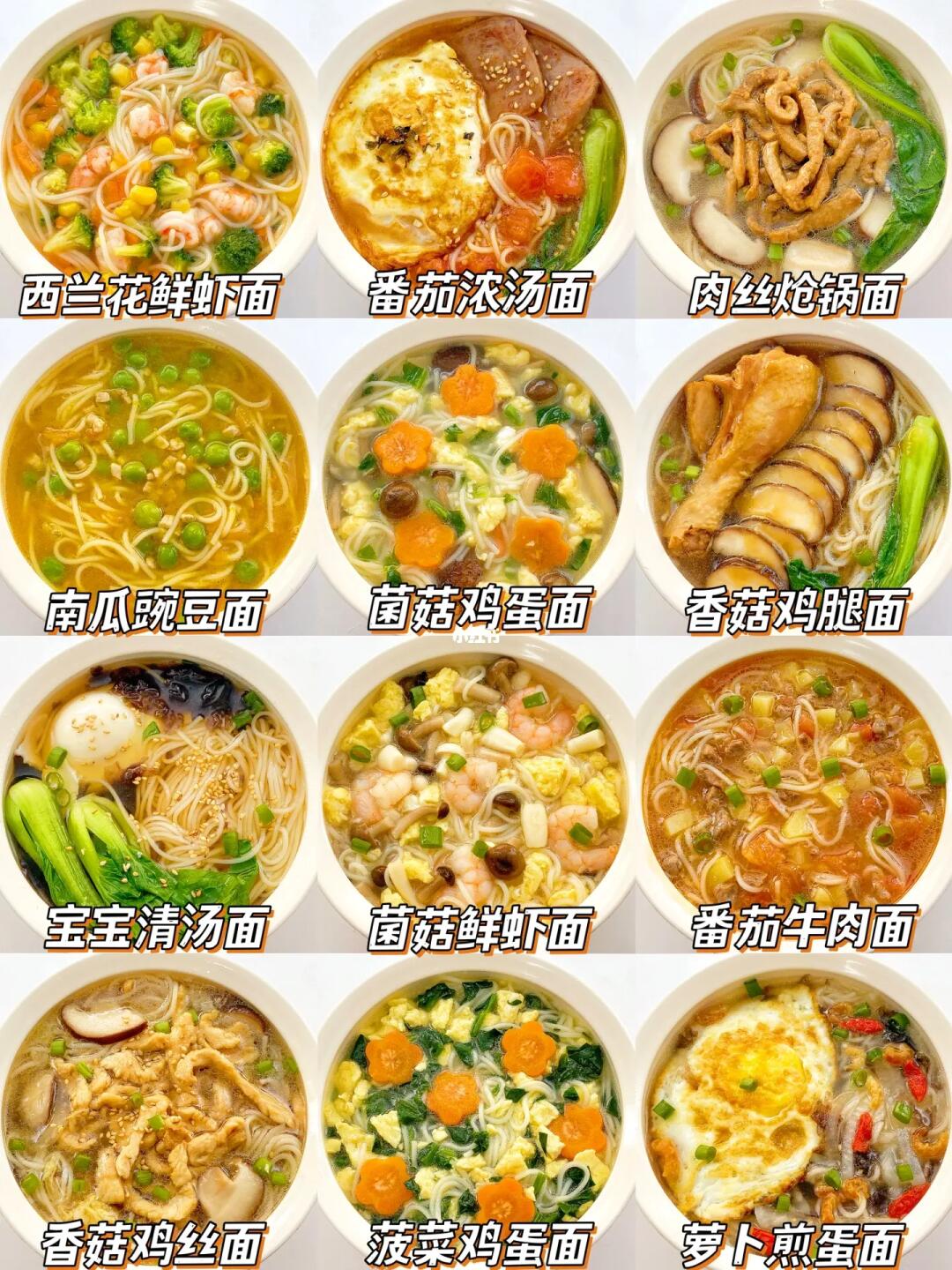 🍜我家小赞一直都是面条控,为了让面条也能吃得营养,所以我会经常创新面条的搭配,让普普通通的一碗面也能吃得满足~ ✅今天整理了12款巨巨好吃的面条做法,都是作法简单,家常快手的,每款都有详细的做法哦,快做起来吧~ ~ 🥦西兰花鲜虾面 🍅番茄浓汤面 🥓肉丝炝锅面 🎃南瓜豌豆面 🥚菌菇鸡蛋面 🍗香菇鸡腿面 🍄香菇鸡丝面 🍳宝宝清汤面 🥔番茄牛肉面 🥕萝卜煎蛋面 🥬菠菜鸡蛋面 🦐菌菇鲜虾面 ~ 🧂调味料根据自己的口味添加,我一般就是放一点酱油或盐就可以了。 • ✨下期见~