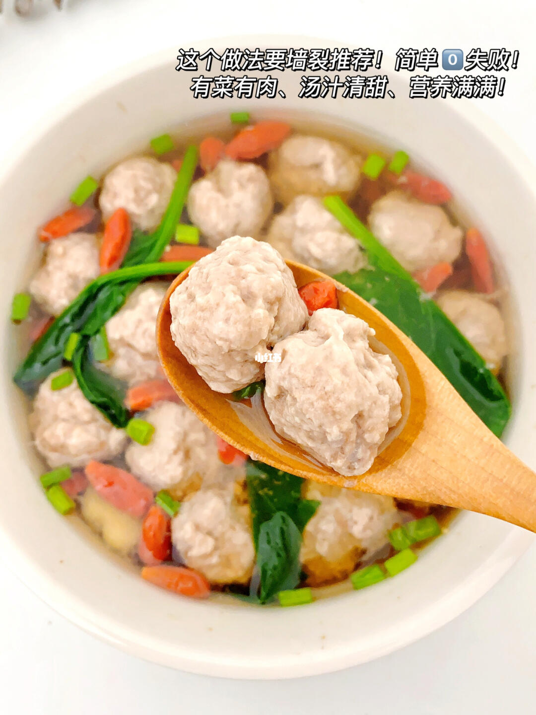 🍡蒸出来的肉丸软嫩不柴,一抿即化,没有牙的小宝宝也可以吃哦。汤汁清甜鲜美,再搭配几棵青菜,一碗营养足足滴‼️