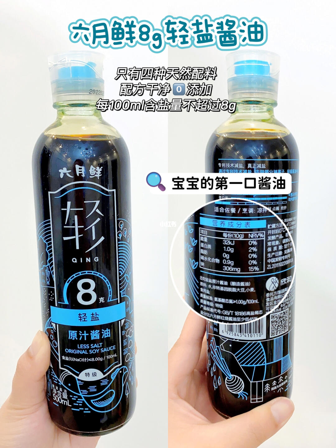 💙轻8g酱油只有四种天然配料,盐分比普通酱油少一半,可以作为宝宝的第一口酱油。炒菜、炖菜、调馅都可以。