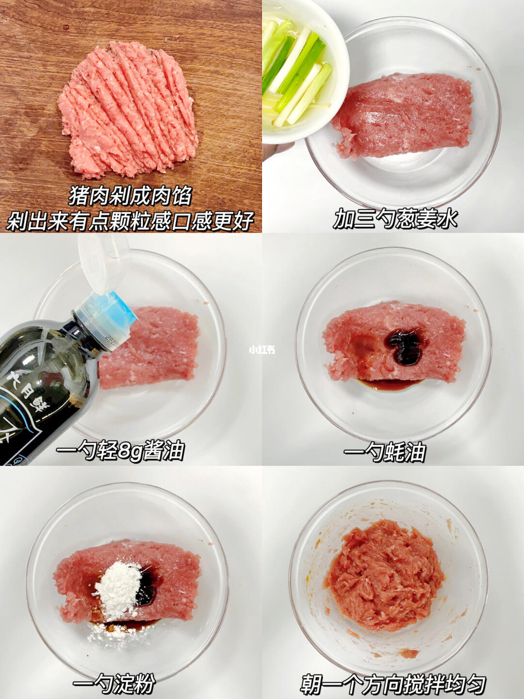 1⃣️猪肉剁成泥,加葱姜水、轻8g酱油、蚝油、淀粉搅拌均匀。搅拌好的肉泥是不太干的,加葱姜水可以让肉丸更嫩,也可以加一个蛋清。