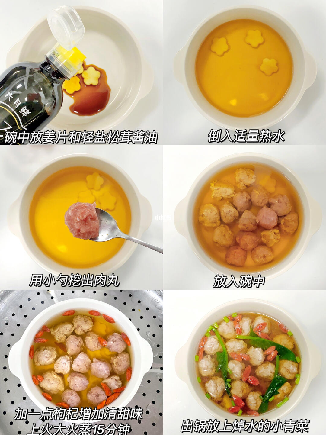2⃣️蒸碗中放姜片和轻盐松茸酱油,倒入适量热水。用小勺挖出肉丸放入碗中,加一点枸杞,大火蒸15分钟。