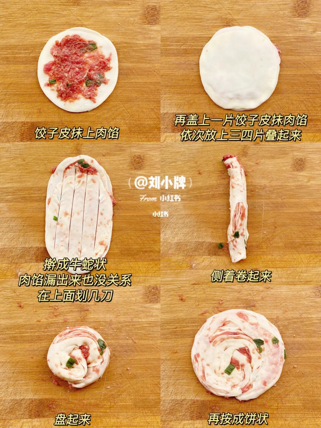 2⃣️饺子皮抹上一层肉馅,再盖上一层饺子皮,大概3-4层的厚度。边缘稍微捏一下,擀成牛舌状,表面划几刀,卷起来,再盘成圆形,按成饼。