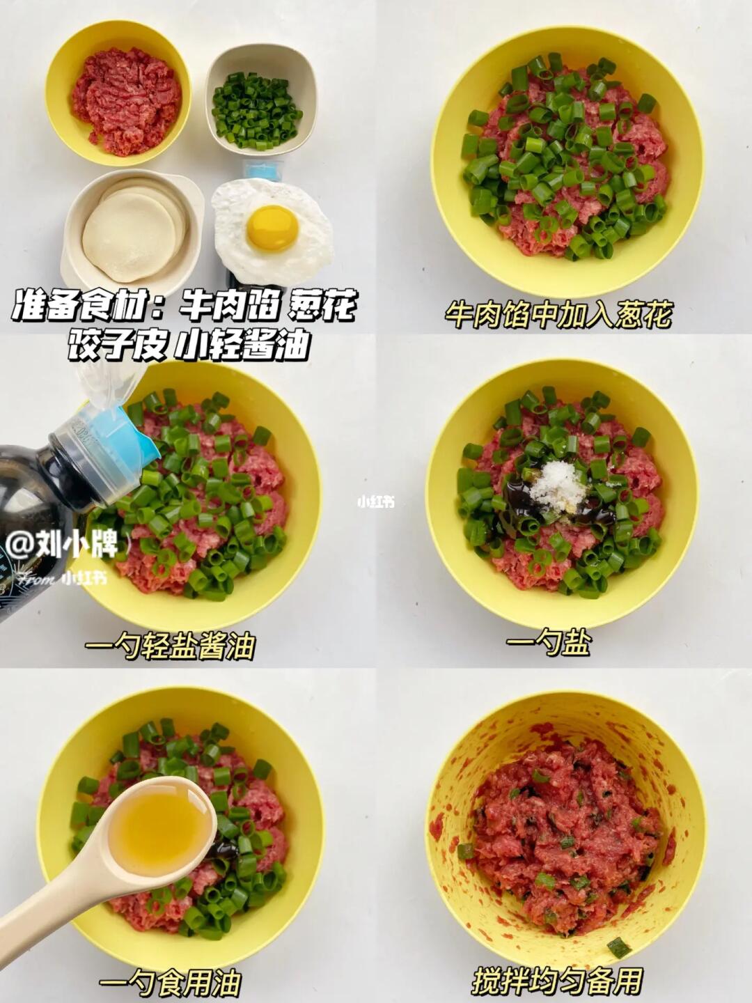 1⃣️牛肉馅中加入葱花,一勺盐和一勺小轻酱油调味。小宝宝吃也可以不放盐只用小轻酱油调味,它的含盐量少,吃起来不会那么咸。配料表简单干净,适合添加在宝宝辅食里调味。再加一勺辅食油,搅拌均匀。