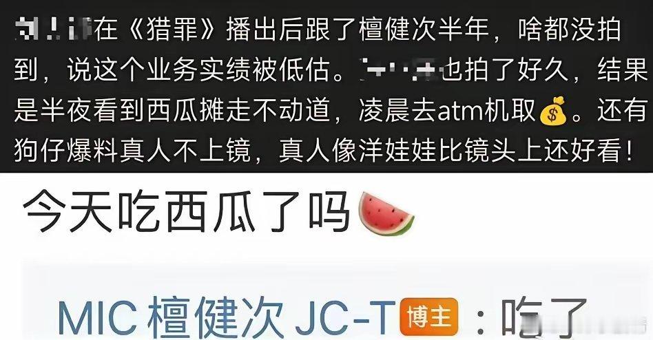 檀健次自从2022年《猎罪图鉴》火了之后,据说有两个狗仔先后跟了他大半年,一个只跟到他下班去美容院,一个只跟到他深夜路过西瓜摊走不动了,除此外再也没有拍到过其他任何负面的东西!