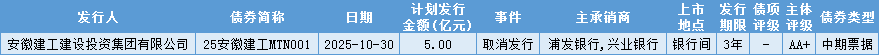本周仅1只债券取消发行,为安徽建工建设投资集团有限公司的3年期中票,原计划发行5亿元。债券主体评级AA+,由浦发银行和兴业银行担任主承销商。