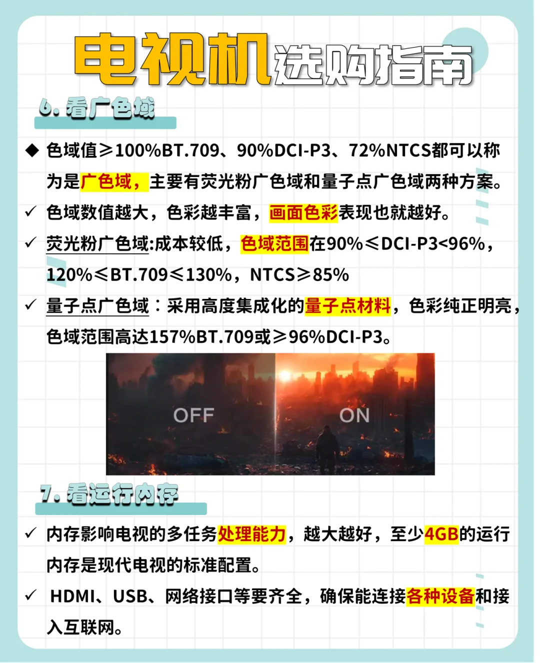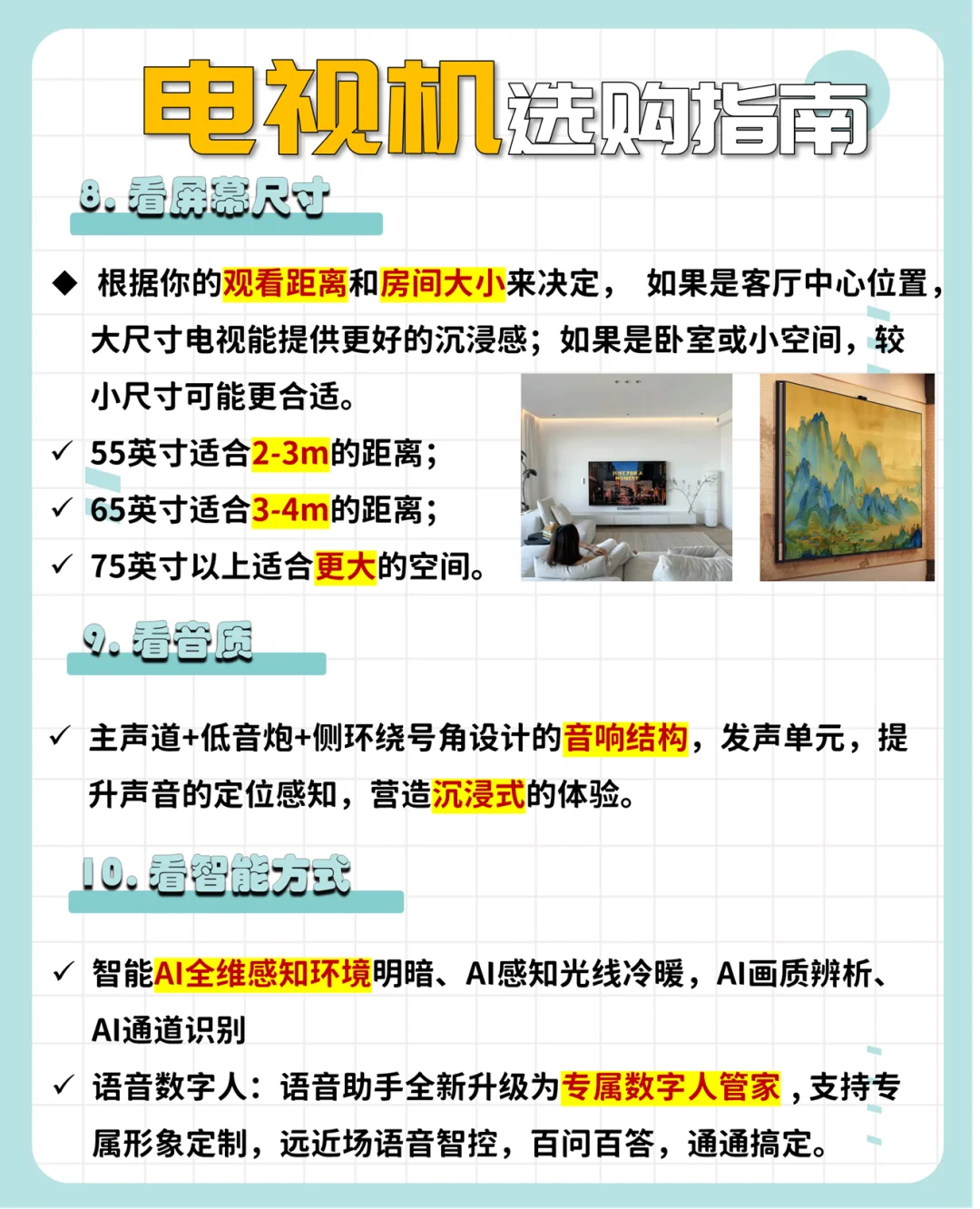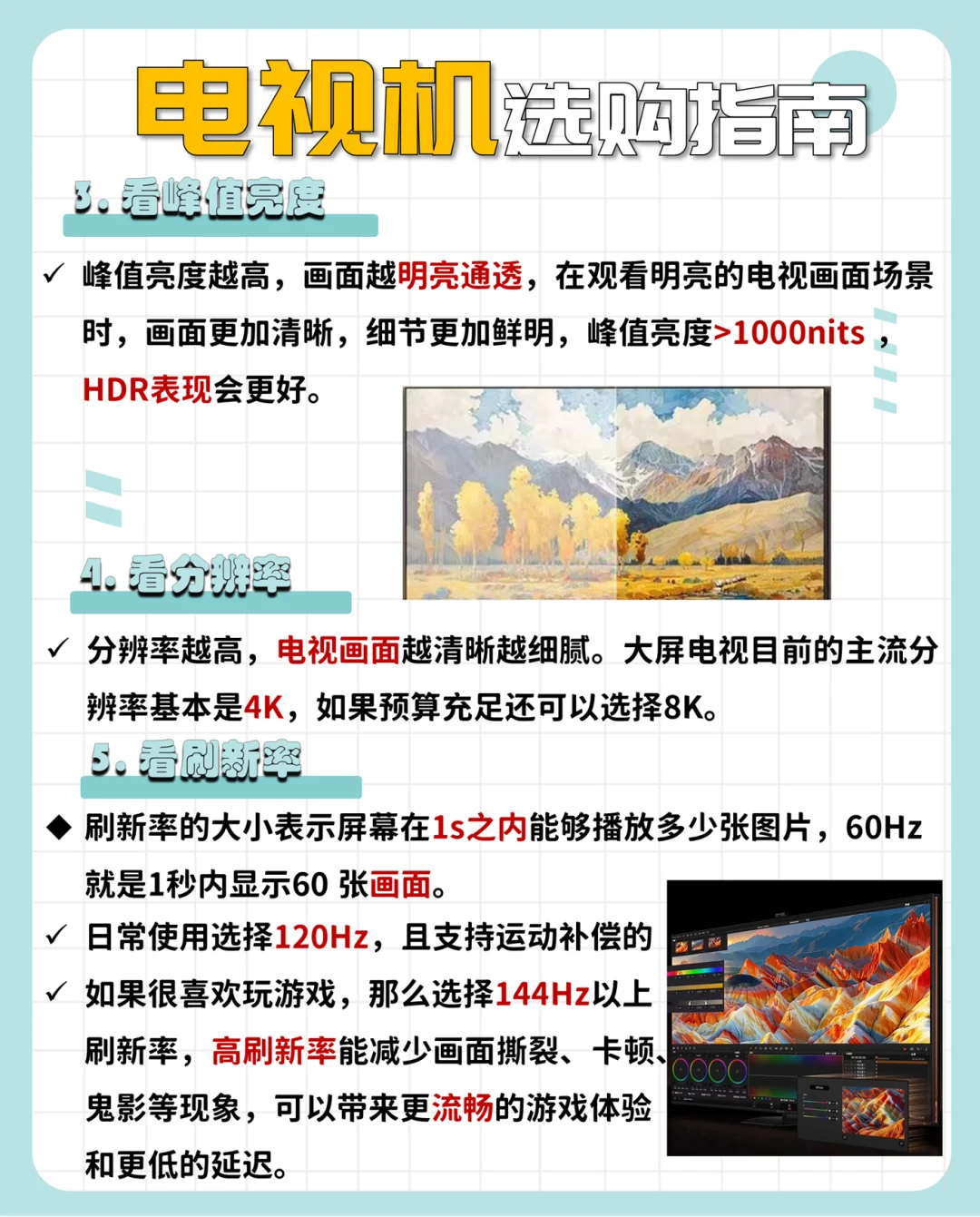 ⭕电视选购指南 [一R]画质芯片(选电视先看芯片)是电视最关键的电子元件 [二R]控光分区是一种提高画面质量和观感的重要手段,可提高画面对比度、提高黑色表现能力、改善暗场漏光问题等方面 [三R]峰值亮度指电视屏幕在显示最亮场景时能够达到的最高亮度水平 [四R]分辨率4k是目前技术较成熟、画质表现较好的标准 [五R]刷新率越高,画面运动越流畅 [六R]广色域电视的色域范围要达到90%以上,93%DCL-P3电影级可呈现的画面丰富且多彩绚丽 [七R]运行内存影响电视的多任务处理能力,越大越好,至少4GB的运行内存是现代电视的标准配置 [八R]屏幕尺寸根据观看距离和房间大小来决定!