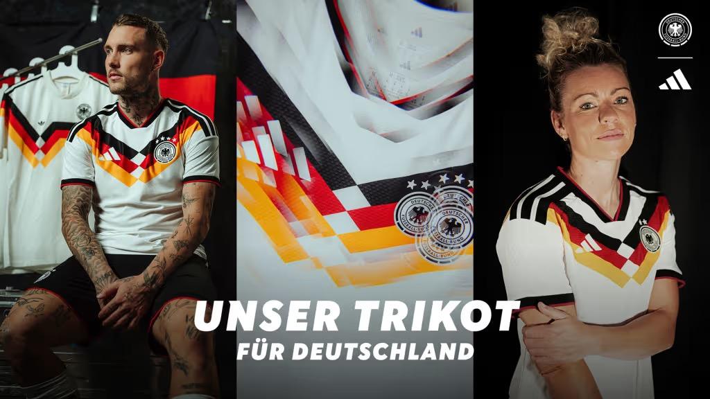 新球衣以德国队传统的白色为主调,胸前饰以黑、红、金三色菱形纹图案,灵感源自德国队历届世界杯经典战袍,象征荣耀与传承。其锯齿状的图案呼应了1994年美国世界杯期间的球衣设计,那也是美国首次举办世界杯。配以黑色短裤与带有菱形装饰的白色球袜,新球衣在复古与现代之间取得了完美平衡,展现出德国足球一贯的经典气质与当代美感。