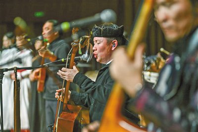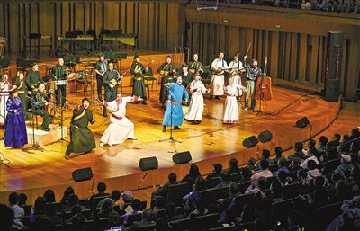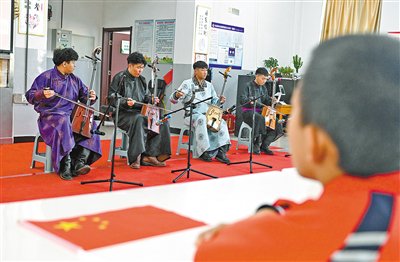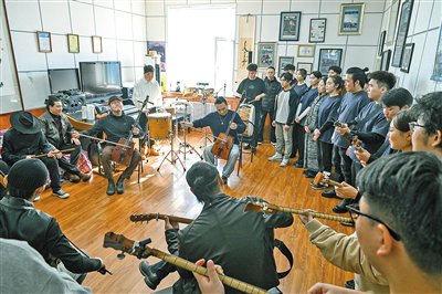 演出前的排练厅常常灯火通明至深夜,导演与参演师生紧密协作,反复打磨潮尔道声部交织、马头琴协奏细节与非遗乐舞编排等。非遗民乐团负责人苏雅直言,排练是“文本记载”与“口传心授”的碰撞,“我们将‘诺古拉’润腔等非遗技法融入演绎,既守传统根脉,又做创新转化。”非遗民乐团雅托噶演奏家海日罕分享了合作心得:“从独奏‘主角’变乐团‘音色粘合剂’,每一次衔接都要反复打磨,弦音里藏着团队默契。”