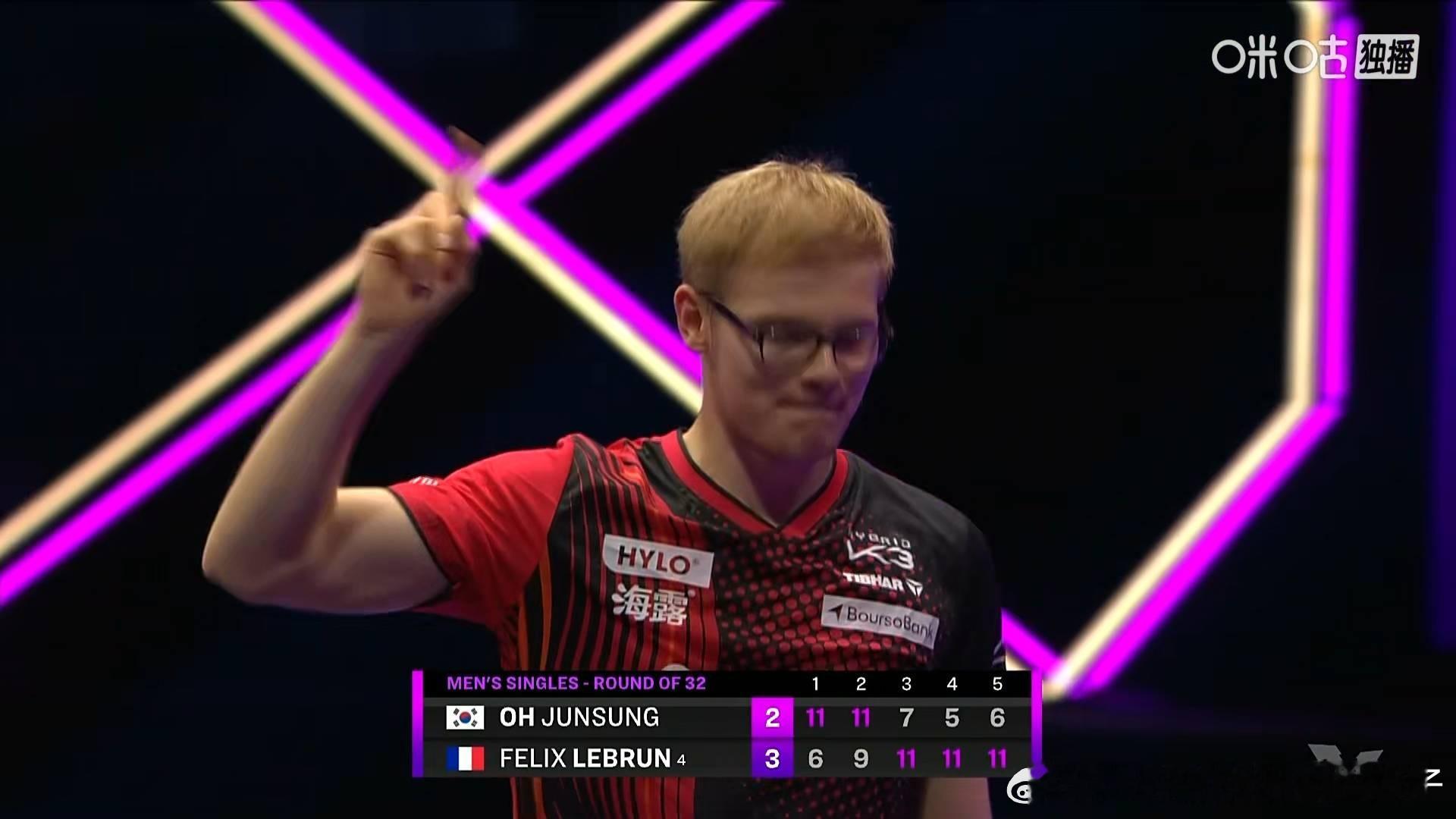 菲利克斯勒布伦3比2吴晙成(-6,-9,7,5,6)晋级2025WTT法兰克福冠