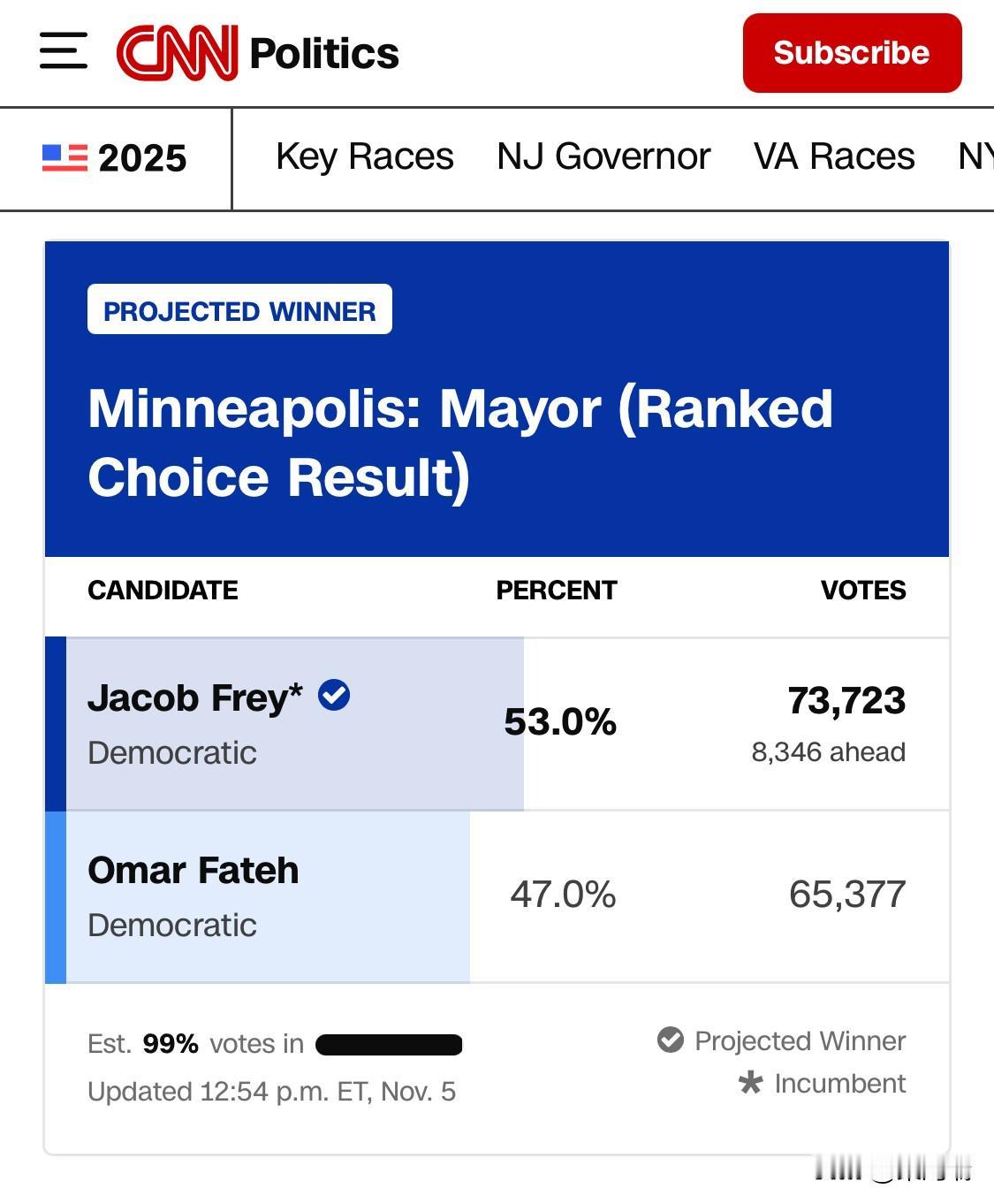 突发:共和党终于迎来一个利好消息,索马里裔“美国人”、社会主义者奥马尔·法特(Omar Fateh)竞选明尼阿波利斯市长失败。 雅各布·弗雷(Jacob Frey)成功连任,开始了他的第三任市长任期。 在最近的明尼阿波利斯市长选举(2025年11月)中,现任市长雅各布·弗雷击败了包括民主社会主义者、州参议员奥马尔·法特在内的多名挑战者。选举采用排序选择投票制(ranked-choice voting),在第二轮计票后,弗雷获得了超过50%的选票,锁定了胜局。