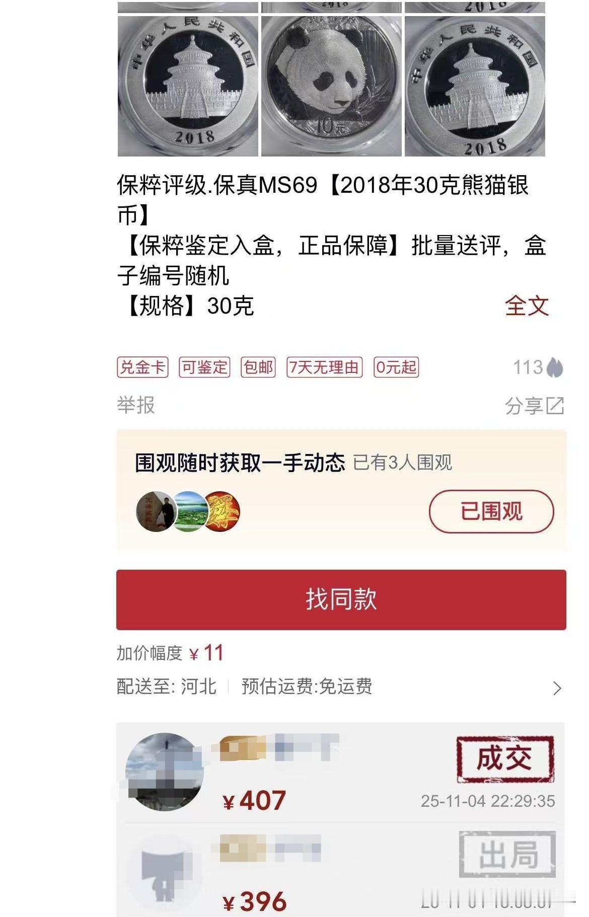 时也?运也? 2023年几乎无人问津的熊猫币。当时国评盒子币,已经破200元,某脆盒子才180元都没有人多看它几眼,急的卖家说,30克银,一克5元,成本就是150元,别说工艺费和盒子费了,再不行我当银子卖总可以了吧?没有人理睬他,当某种物资烂大街时,谁还计较成本呀? 现在随着金银价格猛涨,熊猫币也水涨船高,招人唾弃的某脆盒子也在抢,11月4日晚上成交的这枚2018年熊猫币,竟然拍到了407元,两年的时间,竟然涨了一倍多,真是时也运也? 万物皆是如此,有不受人待见时,就有高不可攀季!熊猫纪念币 金熊猫币 回收金银熊猫币 大熊猫纪念币