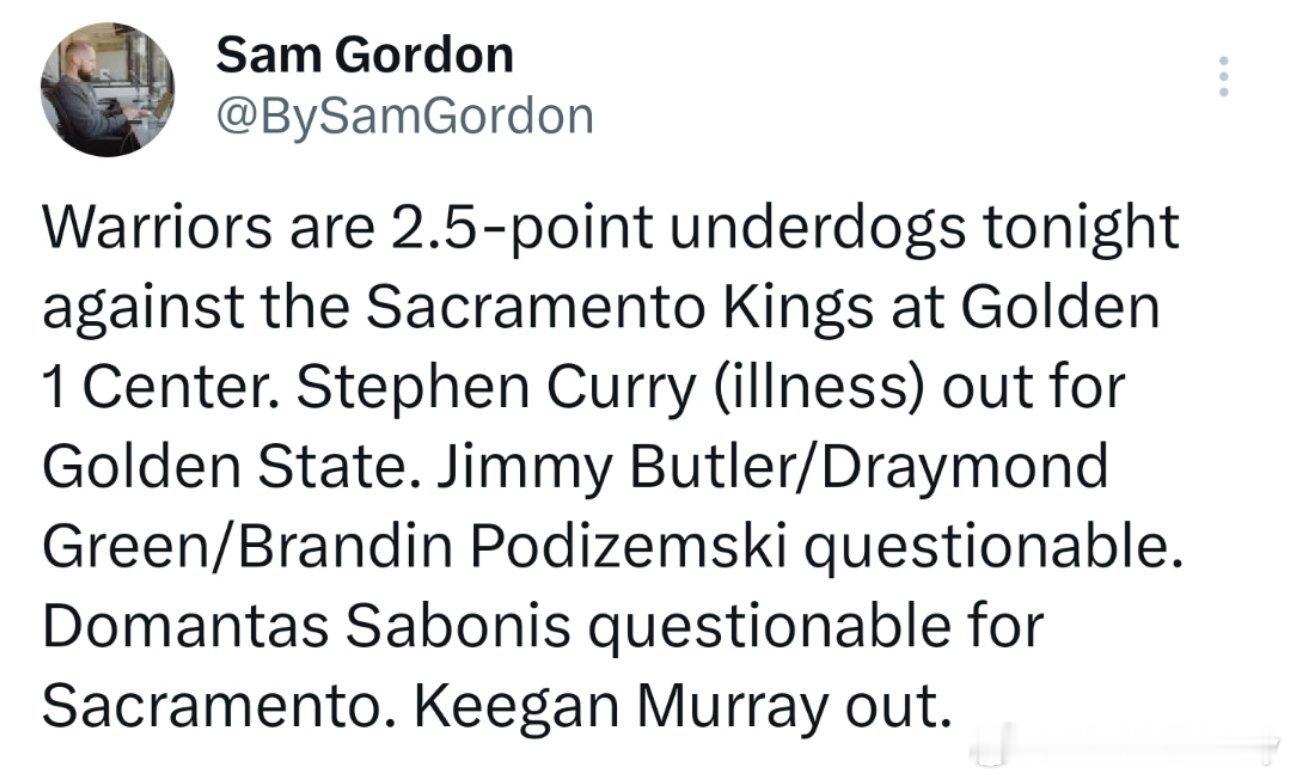库巴今日均不打,勇士对阵国王伤病情况汇总:勇士:巴特勒(背部拉伤)、库里(发烧)