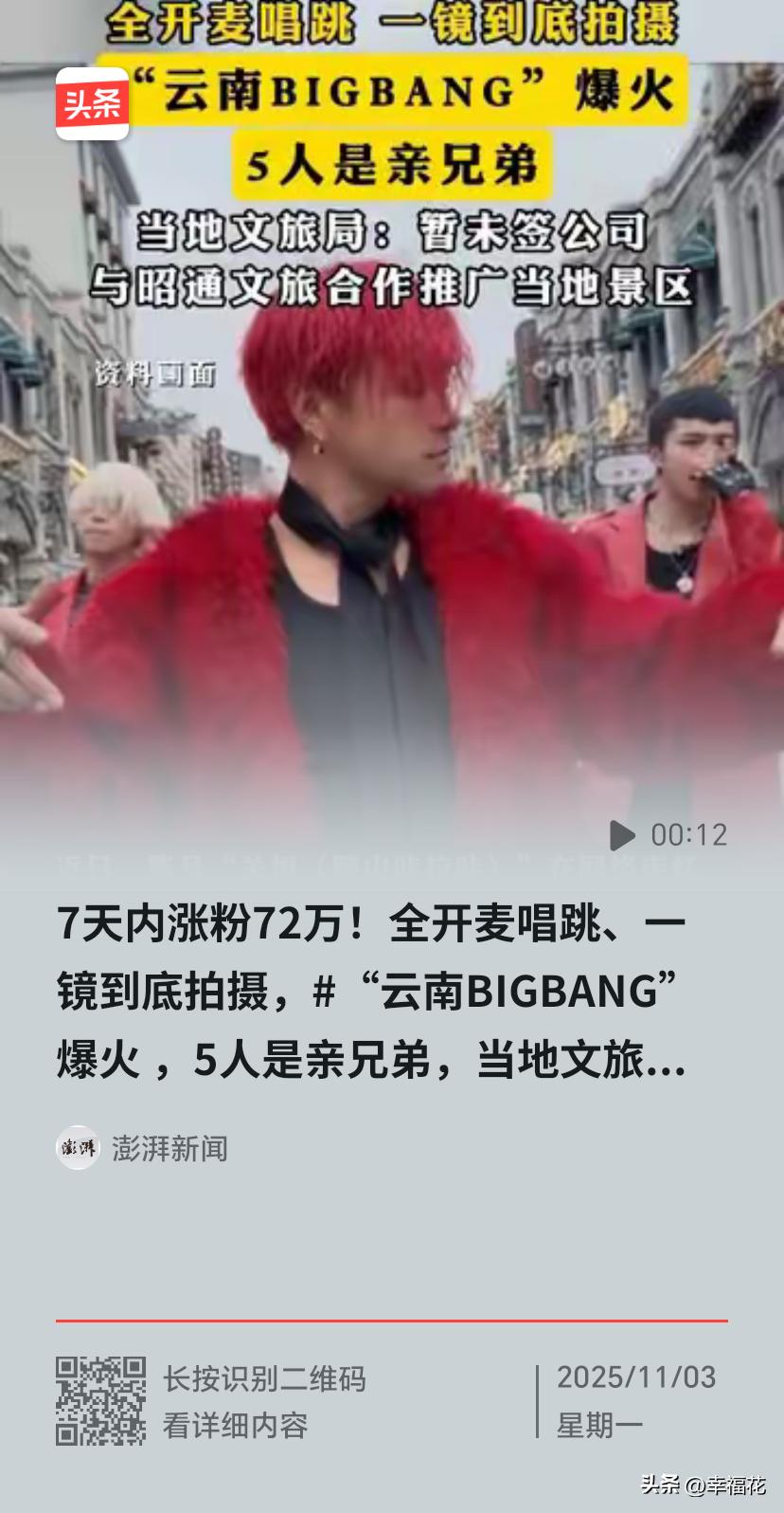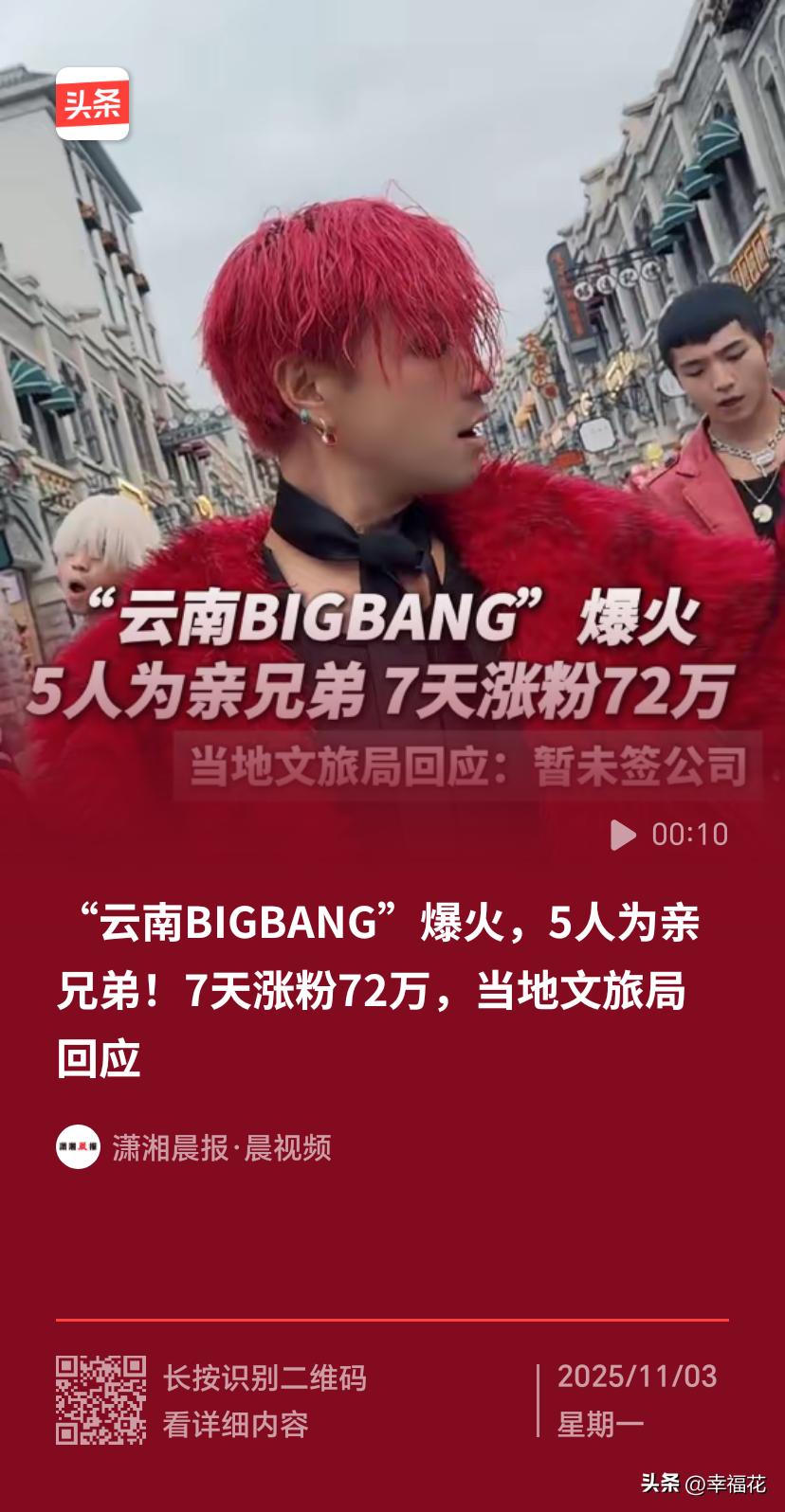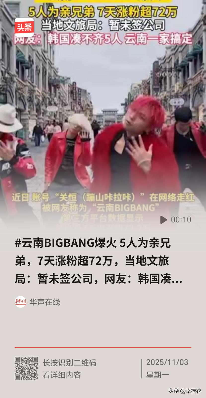 "云南BIGBANG"的爆火,是乡土文化与现代流行碰撞的意外火花。五位亲兄弟在苞谷杆烟雾中复刻韩团舞台,以"全开麦"的质朴表演,7天涨粉72万,颠覆了传统偶像生产模式。这场"乡村演唱会"的魔性魅力,源于三重反差:韩国男团的精致舞台与云南坝子的粗粝现实,娱乐工业的造星逻辑与兄弟天然的默契,城市青年的虚拟追星与乡土生活的真实烟火。 其成功印证了"真实即流量"的传播法则。当关恒被戏称"半志龙",当三轮车与苞谷杆成为舞台布景,这种"土酷美学"精准击中了大众对过度包装审美的疲惫。昭通文旅局的回应更显可贵——暂未签约公司,意味着原生态创作尚未被资本规训。 这场狂欢背后,是城乡文化对话的新可能。正如网友所言:"他们跳的不是舞,是日子本身"。当直播镜头对准苞谷地而非录音棚,或许预示着娱乐产业正在发生某种静默的转向。