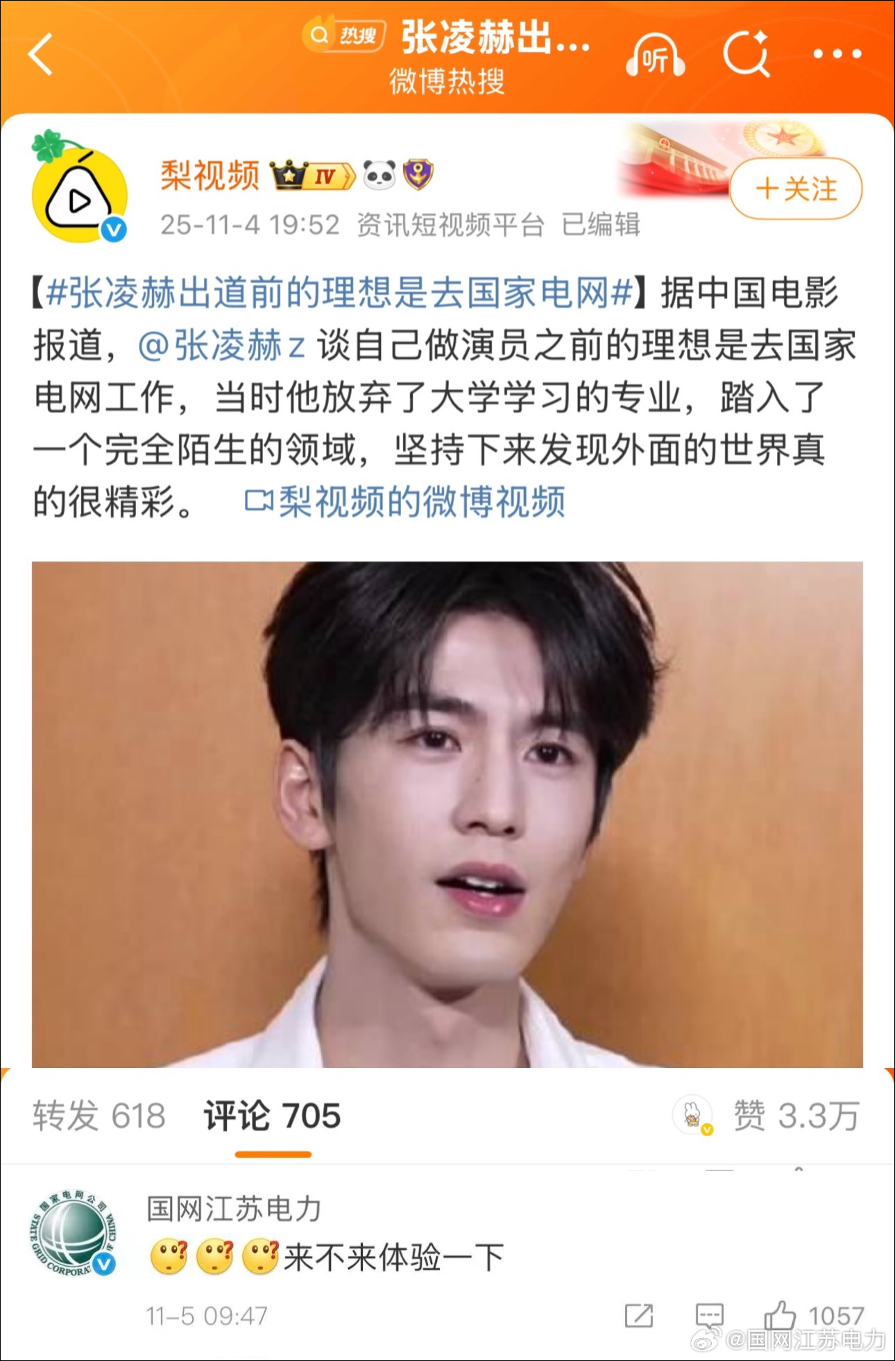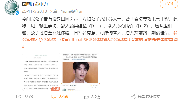 11月5日晚,江苏电力官方微博发文:今闻张公子昔有投身国网之志,方知公子乃江苏人士,曾于金陵专攻电气工程,此缘一见,顿生亲切。鄙人颇具经验(图1),众人亦有期许(图2),遂斗胆相邀,公子可愿至吾处体验一日?若有意,可详询本人,愿共探前路,期谱佳话。