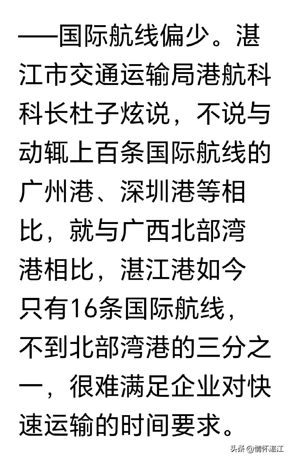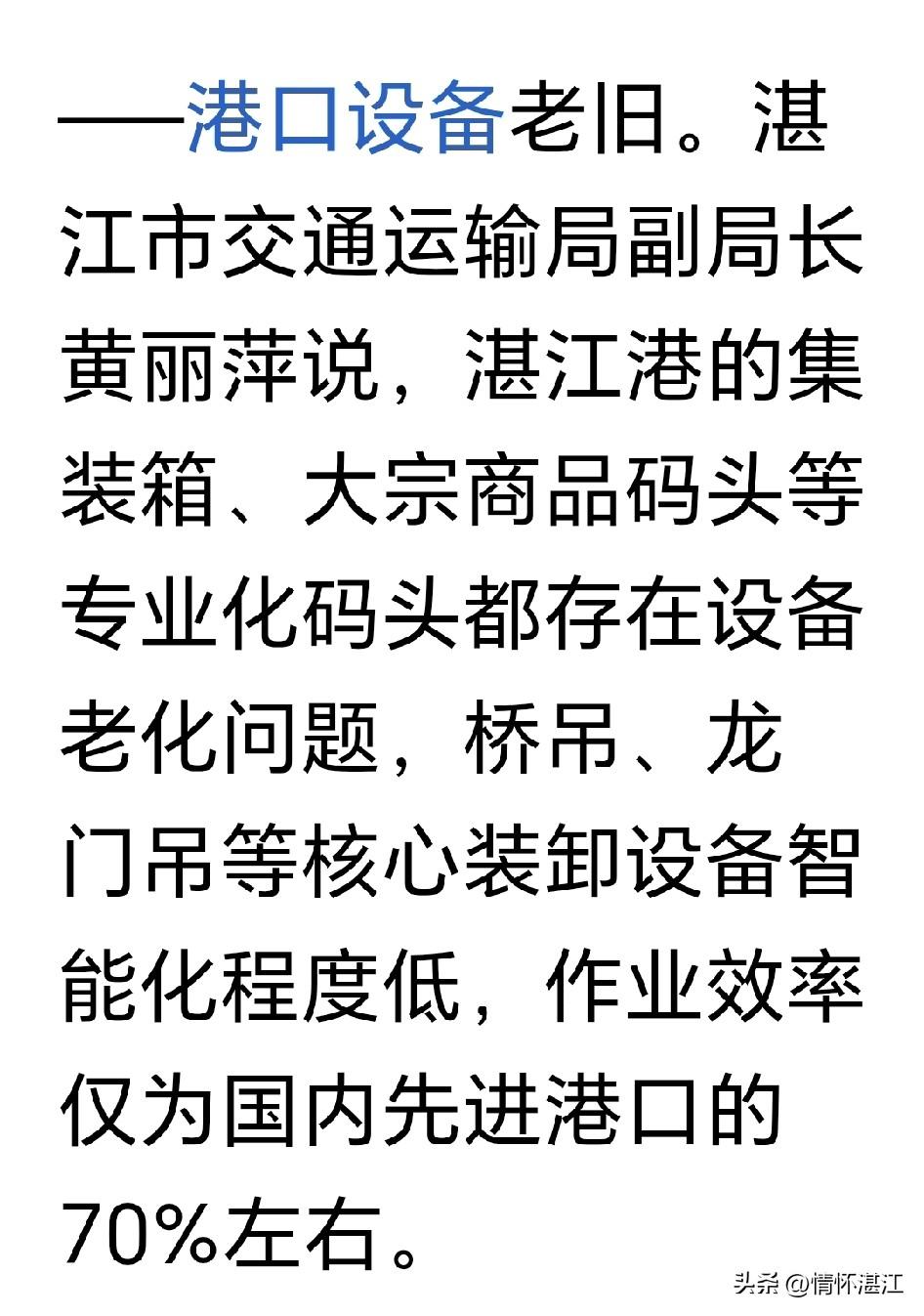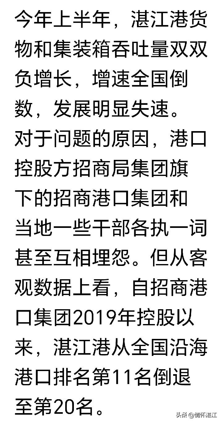 网上出现关于湛江港口的报道,令人担忧。湛江的老市民都知道,湛江以前被称为港城,就是因为拥有南方大港湛江港,湛江港是华南地区40万吨级的深水良港,曾经是国内八大港口之一,加上湛江港所在的地理位置,所以被寄予厚望。现在,湛江港已经被招商局集团收编,属于招商港口集团旗下的资产。本来湛江市期待湛江港在招商局集团的资本实力带领下再创辉煌,但是客观数据告诉这样的事实:湛江港在国内港口排名中每况愈下!从第11名倒退到第20名。当然,这与周边区域的港口崛起有关,例如北部湾港和茂名的港口对湛江港的货物分流影响很大。未来湛江港如何破局?大家不妨为湛江港的发展出谋献策吧!