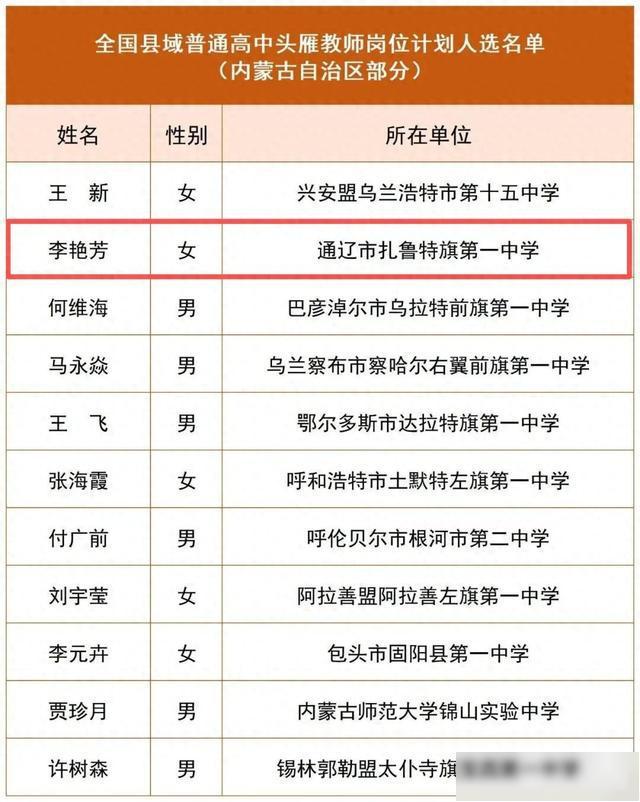 近日,教育部办公厅印发《关于公布全国县域普通高中头雁教师岗位计划人选的通知》,确定首批全国县域普通高中头雁教师岗位计划入选教师600人,其中通辽1位教师入选,一起来看名单——