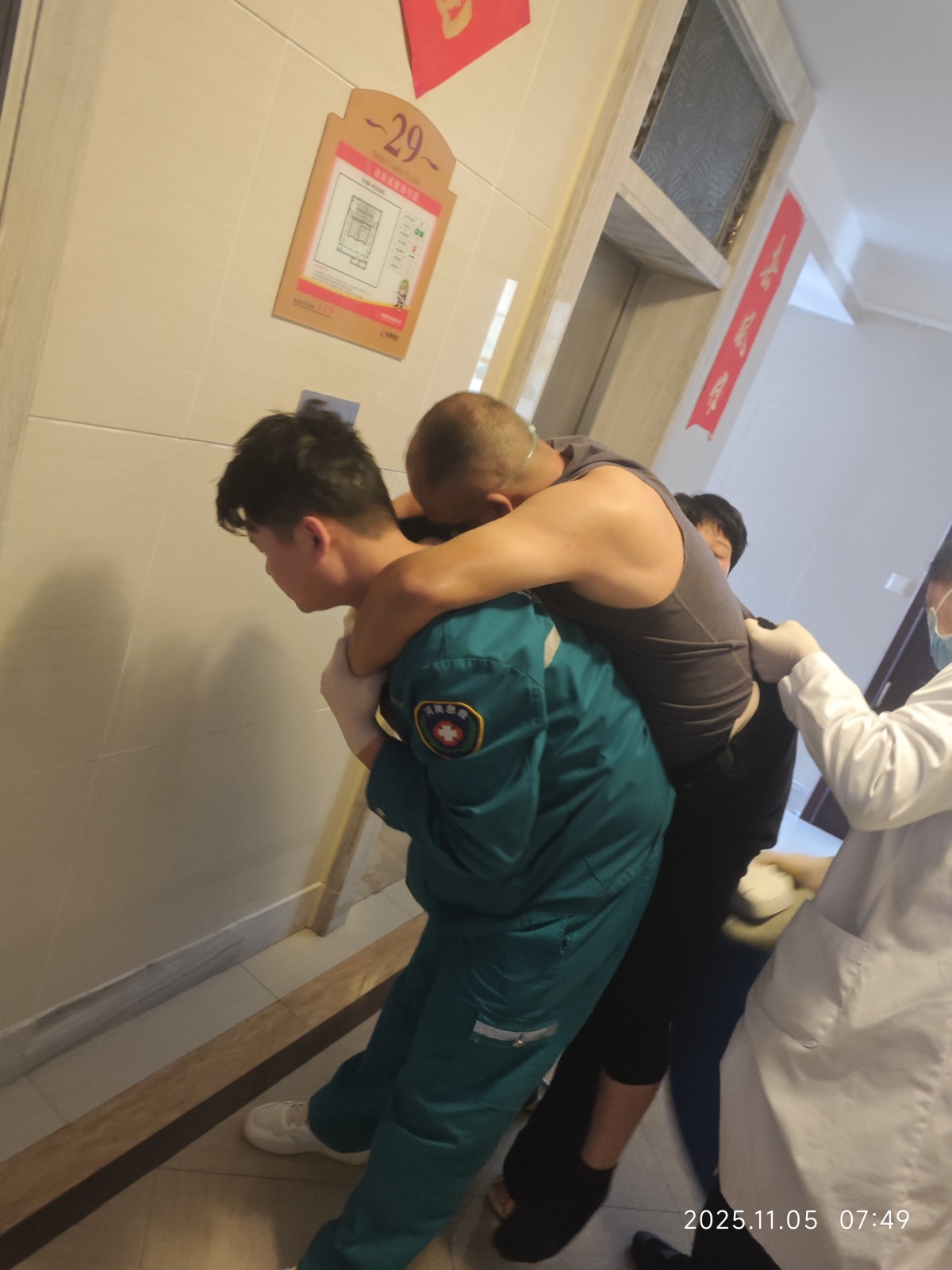然而,由于担架无法进入电梯间,且宋先生家住29楼,如何将他安全转下楼成了难题。情急之下,男护士甄帅森毫不犹豫地表示:“我把他背下去吧!”