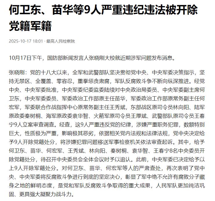 何卫东被拿下之后,军队内部还有动作!在何卫东等九人被拿下之后,11月5日,《解放军报》刊发了“不以铁腕反腐将后患无穷”的署名文章。该文定调称,腐败是战斗力的“第一杀手”,反腐败是最彻底的自我革命,军队越反腐就越坚强、越纯洁、越有战斗力。军队正风肃纪反腐必须严于,高于地方。 这篇文章的定调简直一针见血,直接把腐败称作战斗力的“第一杀手”,还说反腐败是最彻底的自我革命。这话可不是随便喊喊的,看看之前被处理的何卫东、苗华他们就知道,这9人全是军中高级干部,涉嫌严重职务犯罪,数额特别巨大,连党指挥枪的根本原则都给破坏了,对部队政治生态的伤害大了去了。 要是任由这种腐败蔓延,军费可能被贪走,装备采购可能掺水分,基层官兵的士气得受多大打击?这样的军队别说保家卫国,能不能守住底线都难说。 更关键的是,文章里特别强调,军队正风肃纪反腐必须“严于、高于地方”。这其实很好理解,军队是拿枪杆子的武装集团,是守护红色江山的最后防线,容不得半点儿蛀虫。 地方反腐要严,军队反腐就得更严,毕竟一支贪污腐化、军纪涣散的队伍,历史上早就证明了根本打不了胜仗,晚清军队的教训摆在那儿,谁也不敢忘。就像这次明确的,必须“全面严、处处严、越往后越严”,这种态势不是一阵风,而是要往深里挖、往实里抓。 有人可能觉得,都拿下何卫东这样的高层了,反腐该告一段落了吧?但军报这篇文章恰恰说明,根本没到松口气的时候。这些被查的腐败分子,本质上是郭伯雄、徐才厚流毒的发酵变异,清理他们不是终点,而是要彻底铲除腐败滋生的土壤。 而且文章里说得很明白,“军队越反腐就越坚强、越纯洁、越有战斗力”,这背后是实实在在的逻辑,把毒瘤挖掉,军队才能轻装上阵,才能锻造出能打胜仗的精锐之师。 从党中央对这9人的处理也能看出来态度有多坚决:不仅开除党籍军籍,还直接移送军事检察机关依法审查起诉,不管职务多高,在党纪国法面前一律平等,没有什么“铁帽子王”可言。现在军报再发文章定调,就是要给全军敲警钟:反腐没有休止符,不管藏得多深、职位多高,只要敢碰红线,迟早会被揪出来。 说到底,军队反腐从来不是为了“摆姿态”,而是关乎国家安危的大事。一支干净、纯粹、有纪律的军队,才能真正让人民放心。军报这篇文章既是表态,更是行动纲领,接下来的反腐只会更严、更彻底,目的就是把这支人民军队锻造得更坚强、更有战斗力,确保在关键时刻能拉得出、顶得上、打得赢。