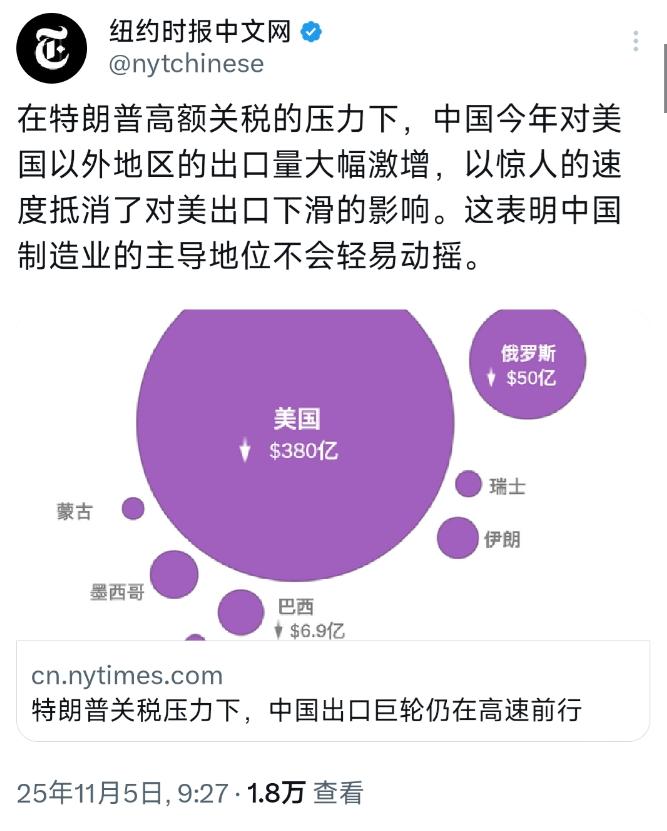 纽约时报中文网11月5日报道:“在特朗普高额关税的压力下,中国今年对美国以外地区