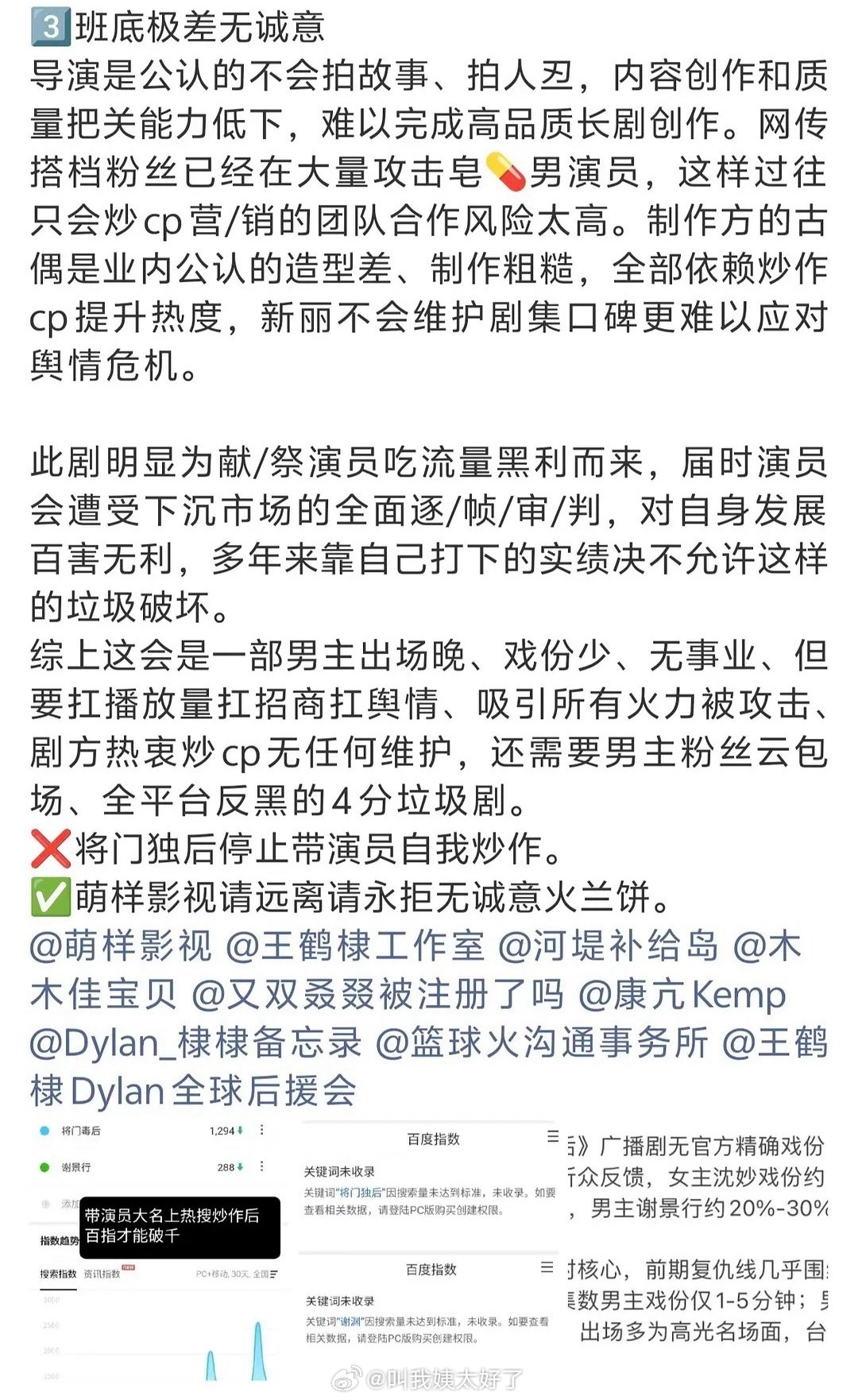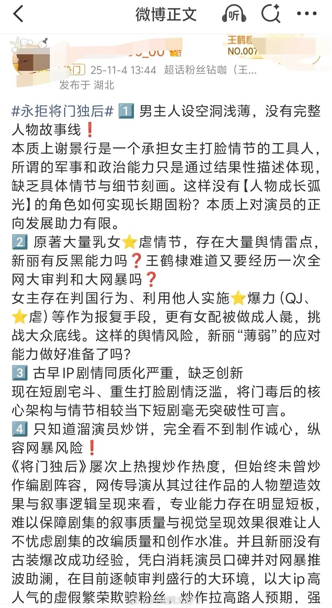 王鹤棣粉丝拒🫓《将门毒后》万转博文,说的挺中肯的