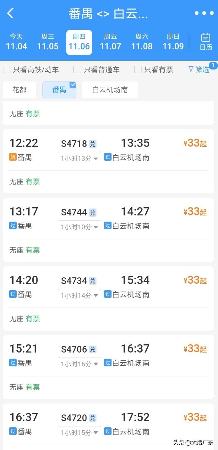 广东城际,从广州南站(城轨番禺站)到白云机场真的只需半个小时吗? 我查了下,实际竟要一个多小时,而且票价要 33 块。要是坐地铁从广州南站到白云机场,同样也得一个小时左右,但票价只要 10 块。 所以,有时候真不能太轻信城际。毕竟它速度不够快,票价还高。 当然,它也有体验感好的一面,绝大部分时候都有座位,相对地铁更舒适。 如果是你,在番禺站和白云机场站通勤,会选地铁还是城轨呢? 广东城际轨道 广东城际路线图 广州城际 广州南站城际 广东城际铁路 广州白云T2 广湛高铁票价 广州南站攻略 广州高铁攻略 广州南站番禺站 广东城际地铁 广州南站换乘 番禺长隆站 广惠城际票价 城轨番禺站