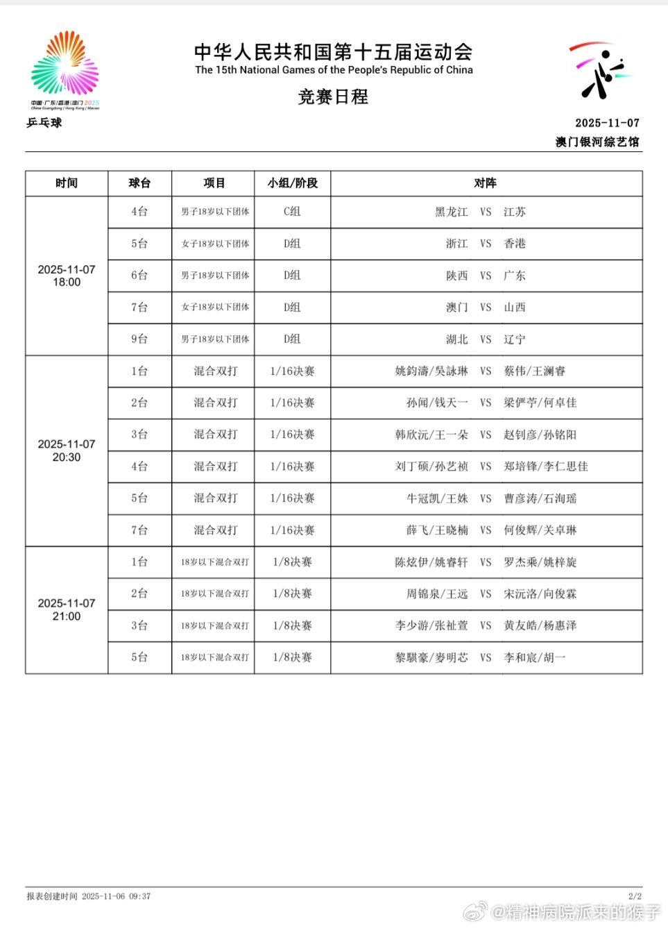 2025年第十五届全运会乒乓球项目第一比赛日赛程:11月7日 10:001台:男