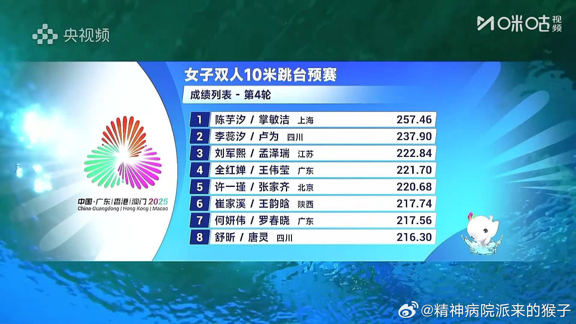 2025年第十五届全运会跳水女子双人十米台预赛前四轮过后: