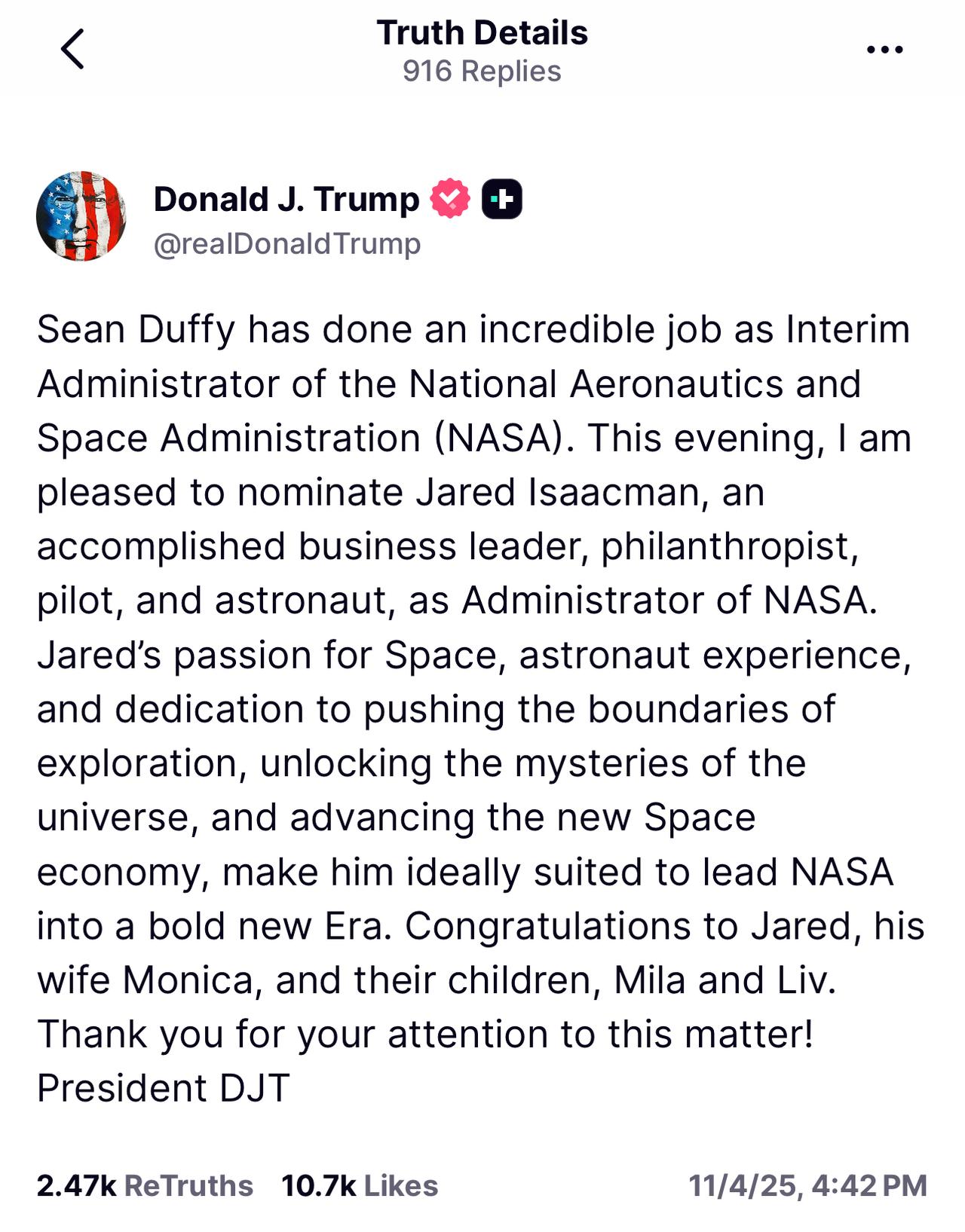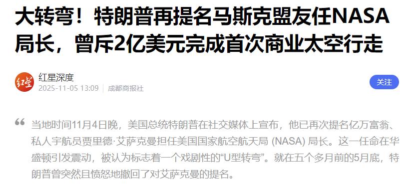 特朗普跟马斯克正式和解,基本上是特朗普服软!特朗普终于提名马斯克的盟友为NASA的老大! 要说美国政坛这出戏,特朗普和马斯克这对“欢喜冤家”的互动总能让人跌破眼镜。还记得今年6月那会儿,特朗普刚因为艾萨克曼给民主党人捐过款,二话不说就撤回了他的NASA局长提名,那强硬态度仿佛在说“我的地盘我做主”。 可短短五个月后,这位前总统就像换了个人似的,11月4日在社交媒体上高调宣布再次提名艾萨克曼,还把人夸得天花乱坠,说他“对太空的热情、宇航员经历和推动新太空经济的奉献,是带领NASA进入大胆新纪元的理想人选”。 这前后反差之大,说是服软实在不为过,毕竟现实摆在那儿,特朗普再不低头,NASA的太空计划怕是真要掉链子了。 现在的NASA的工作,早就离不开马斯克的SpaceX了,看看数据就明白。NASA在商业载人航天计划上砸了超过84亿美元,其中给SpaceX的占30%左右,可就是这30%的投入,让SpaceX完成了100%的载人航天任务。 从签署26亿美元合同以来,SpaceX已经执行了10次载人任务,把34名宇航员送进了轨道,平均每次成本才5500万美元。 反观另一家巨头波音,拿着42亿美元的合同,却只搞了两次无人试验,一次部分成功,一次彻底失败,载人任务推迟了5年多,成本超支快20亿美元,选择依靠谁更靠谱显而易见。 特朗普就算再傲气,也不能跟NASA的前途过不去,而要稳住SpaceX,就得给马斯克面子,提名他的盟友艾萨克曼自然是顺理成章的事。 再说说艾萨克曼这个人,能被马斯克看中、让特朗普“改口”,也的确有两把刷子。这位41岁的亿万富翁可不是只会砸钱的纨绔子弟,16岁辍学创业,靠着卖信用卡终端和修电脑起家,后来创办的Shift4支付公司,每年要给美国三分之一的餐厅和酒店处理超过2600亿美元的付款,商业头脑相当厉害。 更关键的是他对太空的狂热,不仅拥有多种军用喷气飞机的飞行资格证,26岁就驾驶轻型喷气机环球飞行破了世界纪录,后来还组建了世界上最大的私人军用飞机机队,专门帮美军训练飞行员。 在太空领域,他更是和SpaceX绑定紧密,2021年就出资搞了Inspiration4项目,带着癌症患者、医生和小学老师完成了全平民太空飞行;2024年又参与“北极星黎明”任务,成为首个完成商业太空行走的非职业宇航员,为了这次任务,他和团队硬是训练了2000多个小时。 这样既有商业实力又有实际太空操作经验的人,确实符合特朗普口中“推动新太空经济”的要求,而且他和马斯克的盟友关系,无疑能让SpaceX和NASA的合作更加顺畅,这对特朗普来说可是一举两得。 而从政治角度看,特朗普这次服软也是精明的算计。NASA每年250亿美元的预算可不是小数目,太空探索更是美国民众关注的热点议题。 现在SpaceX的星舰单次发射成本宣称能降到5000万美元以下,仅为NASA自家SLS火箭的1/40,这种巨大的成本优势让商业航天成为大势所趋。 特朗普要是还抱着之前的强硬态度,把马斯克得罪透了,万一SpaceX在合作上打了折扣,不仅NASA的重返月球、火星计划要受阻,他自己在选民眼中也会落下个“不懂变通”的骂名。 而提名艾萨克曼,既能向马斯克示好,稳固SpaceX这个重要合作伙伴,又能借着艾萨克曼的“私人宇航员”标签,标榜自己支持商业航天创新,争取科技界和太空爱好者的选票,这算盘打得可太精了。 说到底,政治就是利益交换,特朗普之前的反对不过是摆摆姿态,真到了关乎实际利益的关头,服软也没什么丢人的,毕竟能让NASA继续“大胆探索”,自己又能捞到政治资本,何乐而不为呢?