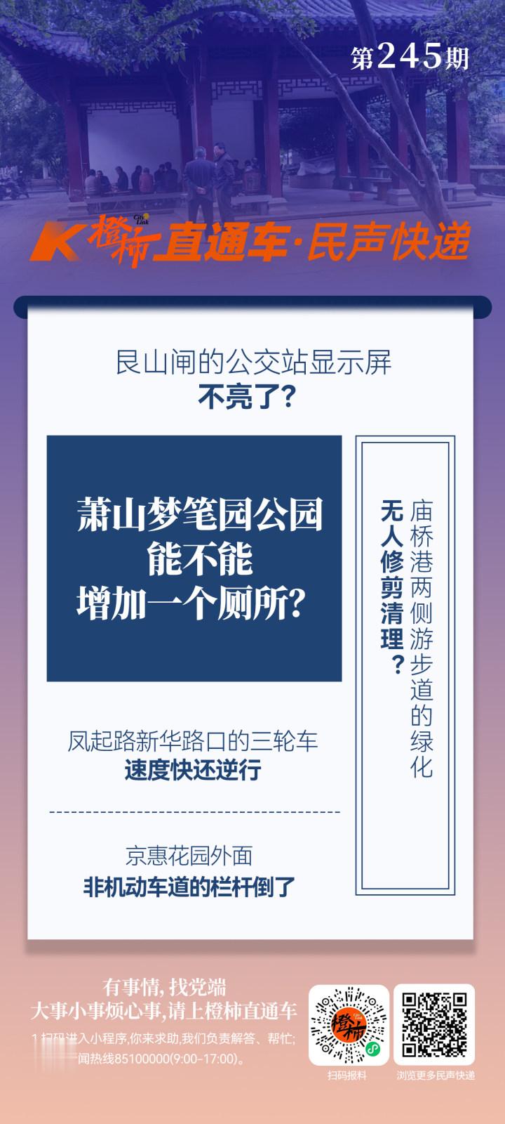 昨天,读者张女士向橙柿直通车反映:萧山区城厢街道江寺社区江寺路与文化路交会处,梦笔园公园(江寺公园边上)有个小茶楼,很多人在此处小便,非常臭,希望此处能建一个公厕,方便老年人如厕,请相关部门协调处理。