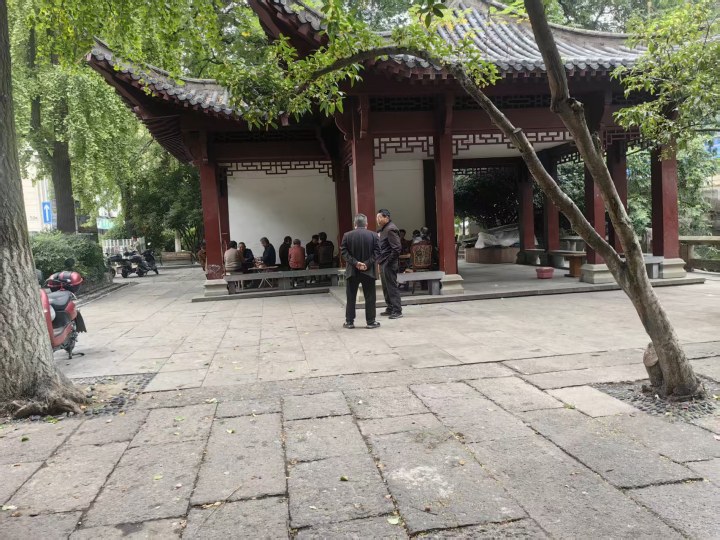 昨天一早,橙柿直通车记者来到梦笔园公园,有三位市民在体育器械上锻炼,小茶楼是一个两层的四角亭子,在茶楼底下放了四张桌子,四桌老人正在打牌。边上是一块空地,再往空地边上走去,确能闻到一股异味。