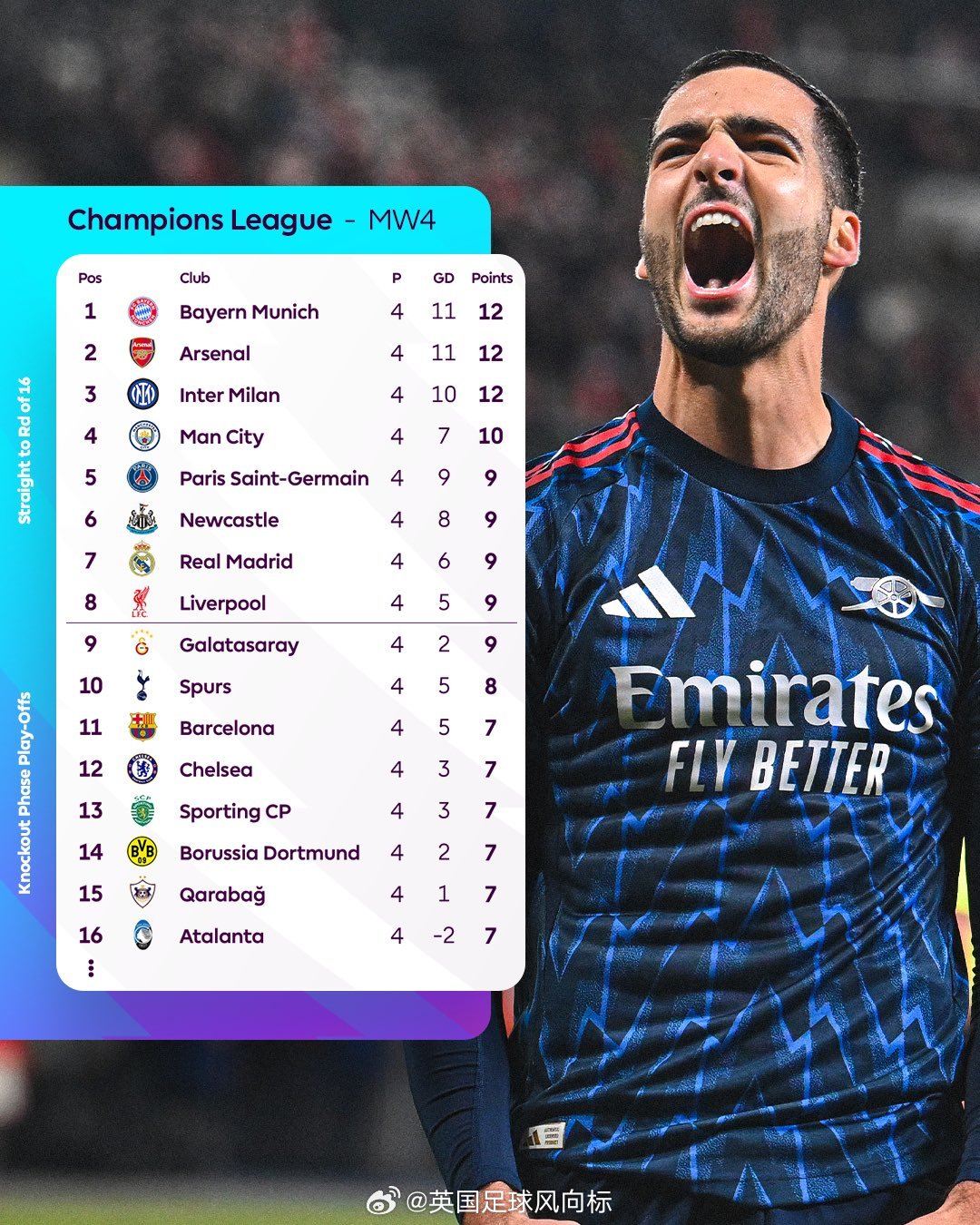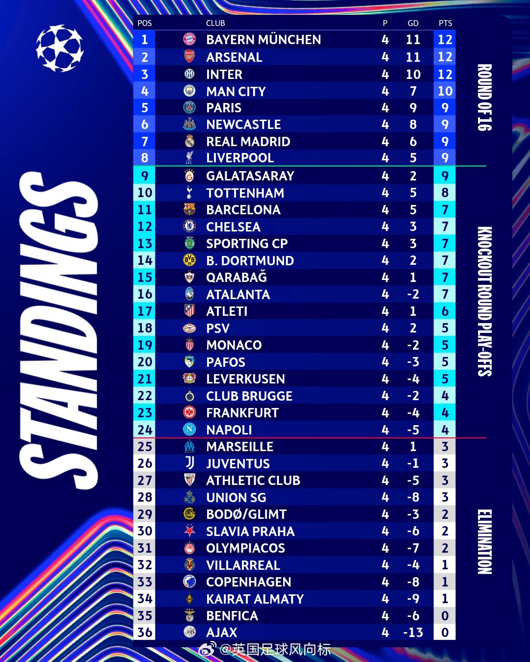 【欧冠积分榜最新形式】欧冠首阶段赛程过半,前4轮比赛过后,拜仁阿森纳国米三支球队