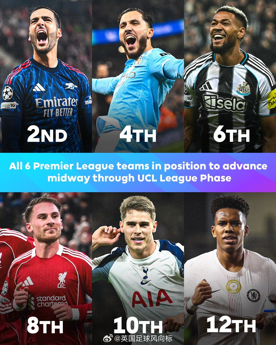 6支参加欧冠的英超联赛,目前全部位居积分榜上半区,阿森纳曼城纽卡利物浦四支更是挤身前八,热刺和切尔西距离前八也是一步之遥,6队都有机会直接晋级16强。