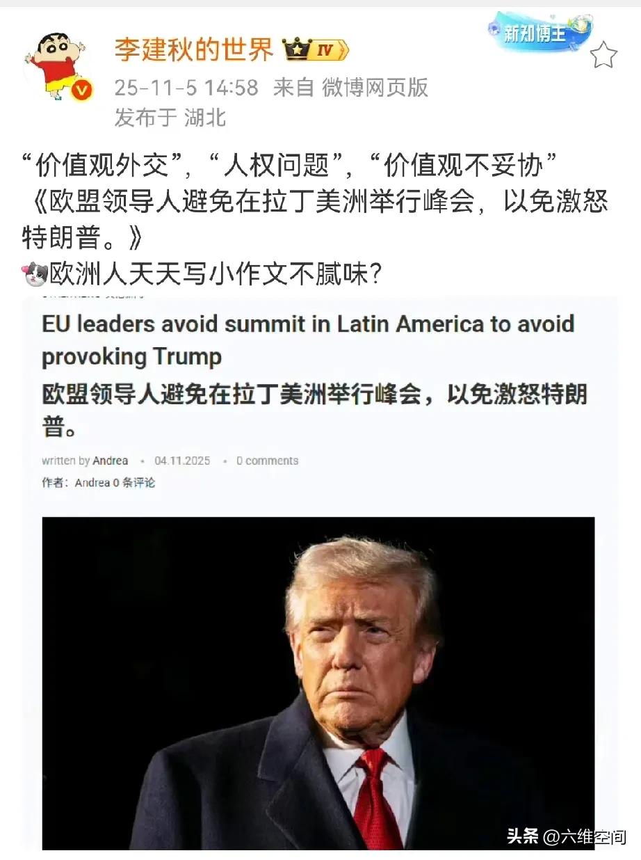 欧洲气数已尽,美国10月出口液化天然气破纪录,70%高价卖给欧洲,而欧洲却还在讲究“共同价值观”,连去拉美参加个会,都怕得罪川普,欧洲的新闻学还写小作文分析为什么不能得罪川普,因为欧美有共同的价值观!所以为什么有专家分析川普比欧美的这群白左要好打交道,因为川普是商人,只有利益交换,但是现在的欧洲跟美国民主党,意识形态太重了,更难打交道,就像现在的欧洲,本来是个人都看出来怎么做,就是和中国改善关系,加强贸易,增加自己跟美俄的谈判筹码,但是欧洲却匪夷所思地反着做,然后被中美俄三方夹击!