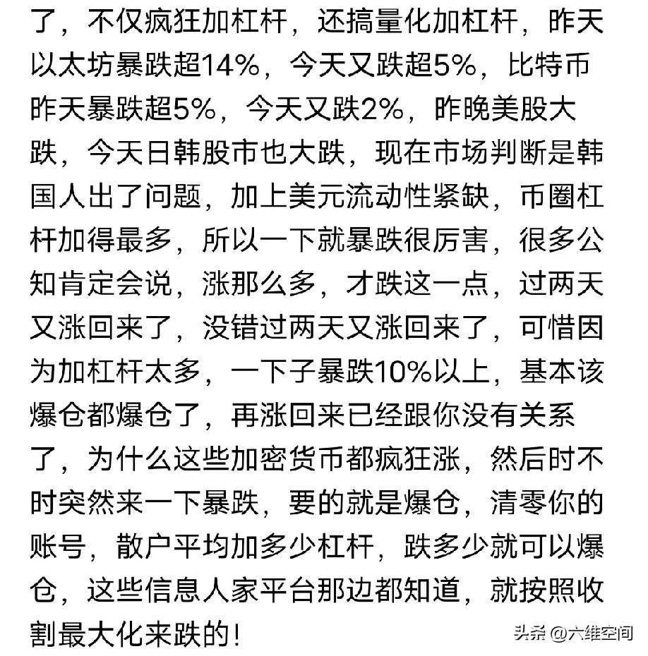 加密货币在疯狂收割散户,不断地暴涨暴跌,让很多散户瞬间爆仓,昨天以太坊暴跌超14%,今天又暴涨近6%,比特币昨天暴跌超5%,今晚又暴涨超3%,感觉加密货币就像一台收割机,这几个月密集地收割,因为炒币赌性都很大的,一般都加杠杆,而且杠杆倍数很大,所以加密货币一个暴跌,很多散户就会爆仓,明天再涨上来,也已经跟你无关了!控制加密货币的资本,估计却钱却疯了,最近一直都是这样收割散户!