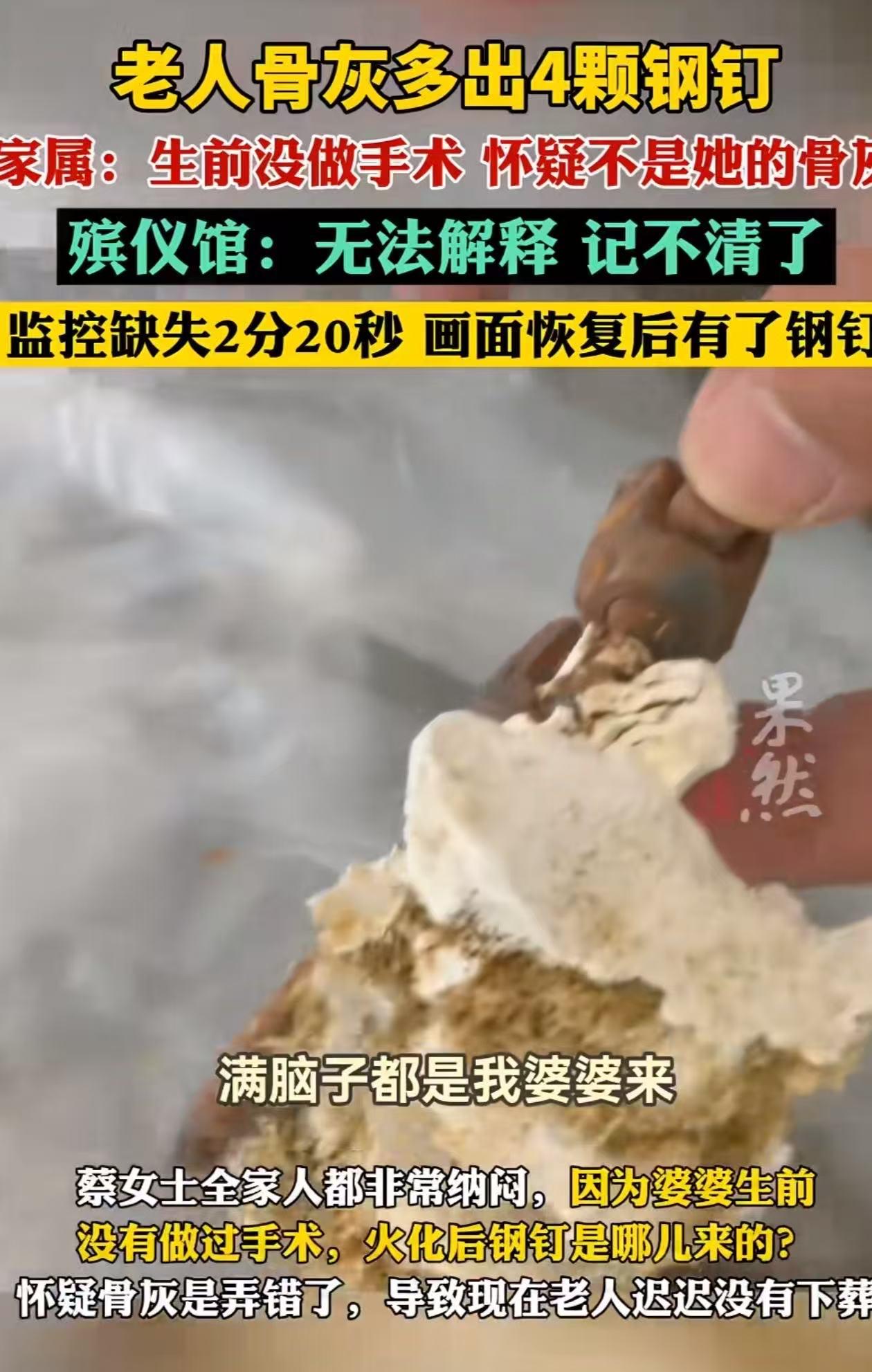 河南新乡,婆婆火化后,骨灰却莫名其妙多出4颗钢钉!儿媳:“我婆婆生前没做过手术,怀疑不是她的骨灰!我们没法给她下葬,没法跟我公公合葬呀,我公公旁边躺的是谁,都不知道!”可是查监控却发现缺失超2分钟…… (来源:小莉帮忙) “我坐在客厅里,满脑子都是我婆婆来说把我找回来,把我找回来……” 接受采访时,蔡女士一脸憔悴,声音带着哭腔诉说着自己的委屈。 这些年,蔡女士一直把婆婆当成自己的亲生母亲一样孝顺伺候,对婆婆那是关怀备至。可命运弄人,婆婆在今年10月份不幸因病去世。 10月19日,到了婆婆火化的日子,蔡女士按照流程去领取骨灰。当她接过骨灰盒,打开一看,瞬间就愣住了,骨灰里居然有4颗钢钉,其中2颗还连着骨头。 蔡女士满心疑惑,婆婆生前从未做过手术,这骨灰里的钢钉到底是从哪儿来的呢? 蔡女士当即就怀疑骨灰弄错了,所以坚决不肯让婆婆下葬。 她心里想着,要是这骨灰真弄错了,以后跟公公合葬,那可怎么跟公公“交代”啊,这不是对逝者的不尊重吗? 然而,当她要求查看火化过程的监控时,却发现视频缺失了关键的2分20秒。 据蔡女士描述,遗体在刚火化完的时候是没有钢钉的,等监控画面恢复后,骨灰里就出现了钢钉。 面对蔡女士的质疑,殡仪馆工作人员给出了这样的解释:因为线路老化导致监控缺失了一部分,而且逝者的火化炉床和其他人的不掺搅。但对于钢钉的出现,他们也无法解释,还猜测可能是工作人员把骨灰摊开了,可具体怎么回事,他们也记不清了。目前警方已经介入调查。 此事引发热议,有网友说, 普通炉子都是混的会打包到别人的灰,豪华炉就可以单人单炉会打扫。火化后还得买骨灰盒、买墓地,最终还是入土,花费了很多没有必要花费的钱,所以说:这个时代不仅仅是娶不起,而且也死不起了! 也有网友说,出事了监控就丢失2分多钟,有这么巧吗?不会是嫌麻烦一锅烧的,然后铲一罐就给你了吧? 还有网友说,有些殡仪馆都是这样,遗体推进去十分钟就把骨灰拿出来了,根本不在乎谁是谁的!给你一盒骨灰就完事了…… 在我看来,殡仪馆作为为逝者提供服务的场所,本应怀着敬畏之心,严谨认真地对待每一个环节。出现这种骨灰里莫名出现钢钉且监控缺失关键画面的情况,实在让人难以接受。 这不仅是对逝者及其家属的不尊重,更暴露出殡仪馆在管理上存在严重漏洞。 相关责任方不能以线路老化、记不清等理由来推脱责任,必须给蔡女士一家一个合理、公正的交代。 否则,如何能抚平家属心中的伤痛,又如何能让公众对殡葬服务行业重拾信任呢?