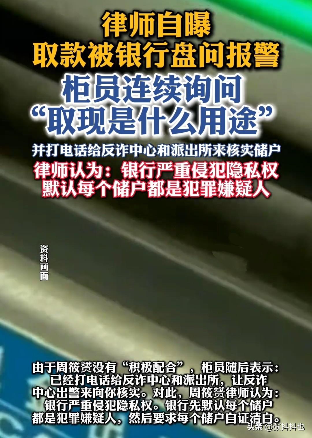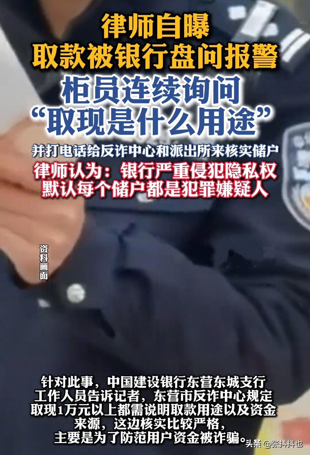 近日,周姓律师发文自曝,在山东东营某支行取款时遭柜员反复盘问取款用途,愤而选择报警。 周律师称,当时自己在山东东营出差,恰逢朋友举办婚礼,便打算取些现金作为礼金贺喜。 他前往就近的建设银行取款,本以为取不到五万块钱是小事一桩,没想到取款时,柜员却反复追问:“取款用途是什么?上个月有人给你转了若干元,这笔钱是怎么回事?” 周律师认为自己有权不回答这种刨根问底的问题,便拒不配合。柜员告知他,已联系反诈中心和派出所,让警方来核实情况。 周律师闻言十分恼怒,他觉得银行此举是默认每个储户都是犯罪嫌疑人,要求储户自证清白,严重侵犯了储户的隐私权。 建行东营支行工作人员表示,东营核实较为严格,取款一万以上的储户需说明取款用途和资金来源,这主要是为防范储户资金被骗,保障储户资金安全。 理由看似充分,只是这次碰上了律师,估计他会与银行较真,不妨拭目以待事情的结果。若周律师胜诉,或许会成为一个分水岭。 届时,储户会拍手称快,银行工作人员可能也会心怀感激,毕竟他们也厌烦这类规定,不问是失职,问了又易遭储户抵触。 有网友郁闷吐槽:“钱取出来怕我被骗,那我的钱在账户里莫名被转走又是怎么回事?” 也有网友分享类似经历:“前几天取四万,派出所的人追上门询问用途,真是又气又好笑。以后是不是把钱放支付宝或微信里,取用更方便?” 大家一直没弄明白,网络诈骗为何能秒转成功,而正规储户取款却如此艰难。若真遇急事,岂不是连救命钱都难取出? 取钱问用途 取款经历 储户取钱困扰