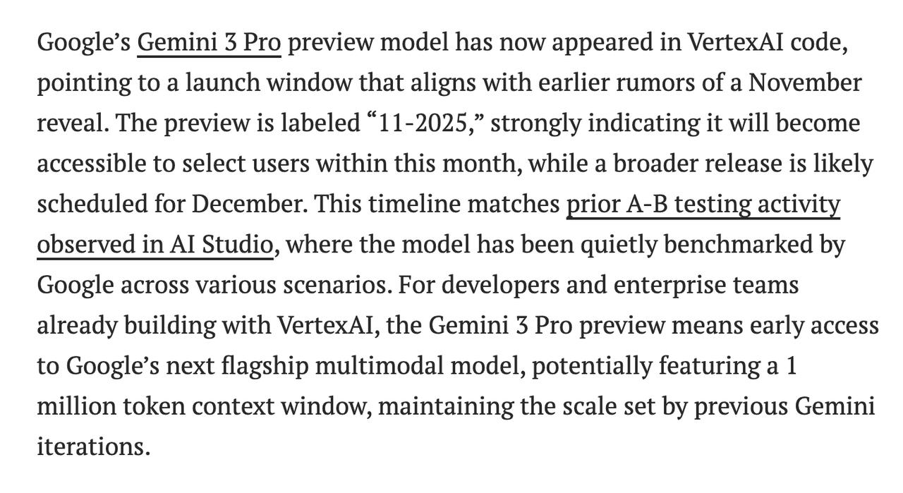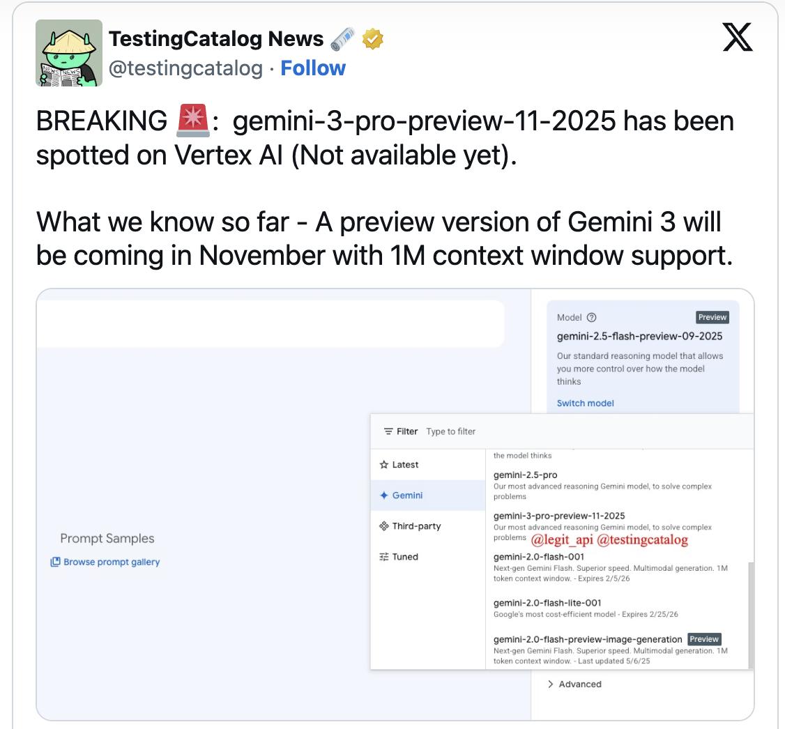 Google 的 Gemini 3 可能真的要来了 有人从 Google Vertex console 里挖到了Gemini 3 Pro preview 相关的信息:“gemini-3-pro-preview-11-2025”,从这个版本来看 Google 在11月 release Gemini 3 基本上是板上钉钉了。 据说模型能力很强大,毕竟是从2到3的大版本跨越,不知道会不会比GPT 5强多少。。