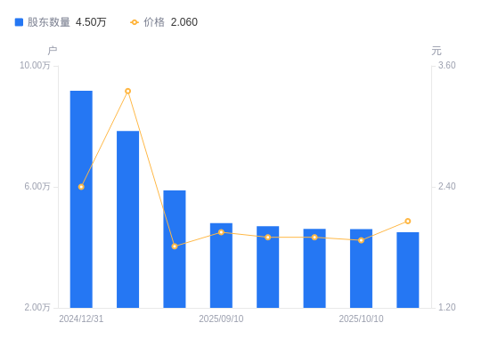 日期A股户数(户)流通A股户均持股数(股)户均持股市值(万元)2025-10-314500023161.654.772025-10-104600022658.144.242025-09-304613622591.344.292025-09-194700022176.054.212025-09-104800021714.054.232025-06-305884417712.503.212025-03-317846613113.204.392024-12-319180111208.382.692024-09-304169924778.804.762024-06-304386023557.943.60