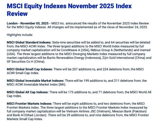 按总市值计算,MSCI全球指数新增的最大3只证券为美国CoreWeaveA、荷兰NebiusGroupA、美国Insmed。MSCI新兴市场指数新增的最大3只证券为印度尼西亚BaritoRenewablesEnergy、中国紫金黄金国际、中国广发证券H股。