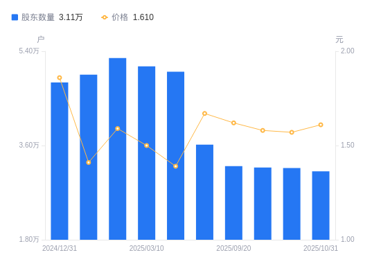近一年(2024年12月20日至2025年10月31日),*ST辉丰A股股东户数从4.59万户,减低至3.11万户,降幅32.35%,区间股价下跌30.60%。