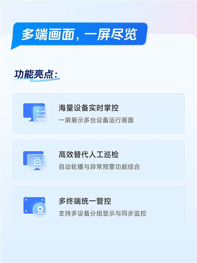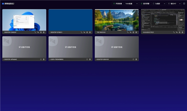该功能面向企业管理与运维团队,可实现批量设备画面的统一监看,支持多台设备同步查看、自动刷新轮巡;适用于IT运维监控、生产调度、远程教学、以及多设备管理等场景,有效提升企业远程管理的效率与安全性,帮助企业用户可以低成本搭建一个基于远程控制的屏幕集中监控体系,实现降本增效。
