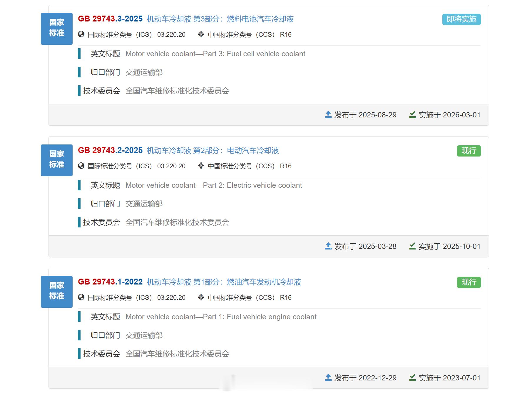 GB 29743就明确了机动车冷却液的要求(见图1)。考虑到不同的动力形式对冷却液的要求不同,在细分标准上,还拆分出了三份标准,分别对应燃油车、电动汽车和燃料电池汽车,所以还是很严谨的。