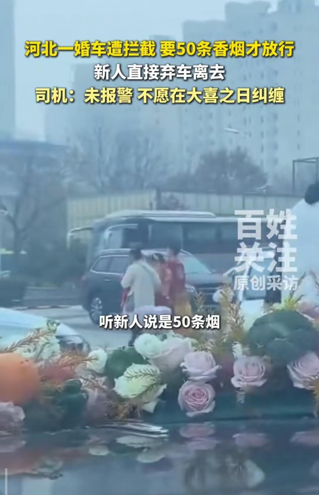 必须严惩!河北,一对新人结婚,婚车遭拦截,被索要50条香烟!!!新人不堪纠缠,打车离去!婚车司机:被堵了1个多小时!网友:50条香烟,已经够刑罚了,虽然构不成抢劫罪,我觉得够敲诈勒索罪,以婚车不让过为由实施勒索钱财之事! (来源:百姓关注) 婚礼当天,婚车整装待发,突然冒出来几个人,直接拦住了婚车,张嘴就向新人讨要喜烟。 新郎和新娘一开始也没太当回事儿,觉得大喜的日子,图个吉利,给人家几根或者一包香烟,都是小事儿一桩,没必要因为这点事儿坏了心情。 可谁能想到,这几个人狮子大开口,竟然提出要50条普通的香烟,或者换成10条最贵的香烟。 这可把新郎和新娘惊得目瞪口呆,50条香烟啊,那得花多少钱呐! 而且自己和这些人压根就不认识,他们这不是明摆着借着讨喜的名义,干着抢劫的勾当嘛! 新郎强忍着怒火,好言好语地和对方沟通,希望对方少要一点。可对方根本就不听,死活就是不让婚车走。 这一堵,就是1个多小时。新郎不停地看时间,眉头紧紧地皱在一起,心里又急又气,这大好的日子,就这么被这些人给搅和了。 而那些拦车的人呢,却一脸得意,觉得自己吃定了新郎和新娘,肯定能得偿所愿。 就在新郎急得不知所措的时候,新娘展现出了她的善解人意。她温柔地对新郎说:“咱们别在这儿和他们纠缠了,下车打车走吧,别因为这事儿坏了咱们的心情。” 新郎一听,眼前一亮,觉得这是个好主意。于是,他毫不犹豫地带着新娘下了婚车,扬长而去,只留下那些拦车的人站在原地,目瞪口呆,一脸的难以置信。 后来,婚车司机把这件事发到了网上。司机说,新人考虑到是大喜的日子,不想因为这点事儿过多纠缠,所以没有选择报案。不过,到现在车队的尾款还没结清呢。 此事引发热议,有网友说,能要50条的,当地也是混社会的,不然谁敢呀。人家不愿报案,是怕事后麻烦上身吧? 也有网友说,就拿准了人家结婚不想报案找麻烦的心理,但是,不能怕麻烦,要勇敢报报案,当地派出所应该严厉打击这种拦路抢劫行为!!! 还有网友说,这属于敲诈勒索了!就是100块钱一条的烟,50条也有5000块了。如果是我,一定要跟他较真报案! 在我看来,这种借着传统习俗之名,行敲诈勒索之实的行为,实在是令人不齿。 传统习俗本应是传递祝福、增进情感的纽带,而不是某些人谋取私利的工具。 这些人打着讨喜的旗号,肆意妄为,不仅破坏了新人的婚礼氛围,也严重损害了社会的公序良俗。 相关部门必须加强监管,严厉打击这种恶劣行为,让传统习俗回归其本真,别让这些“害群之马”玷污了美好的传统。